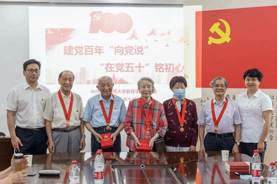教育学院党委书记李玲、教育学院院长雷万鹏为沈立明同志、杜俊英同志、刘芹茂同志颁发“光荣在党50年”纪念章。