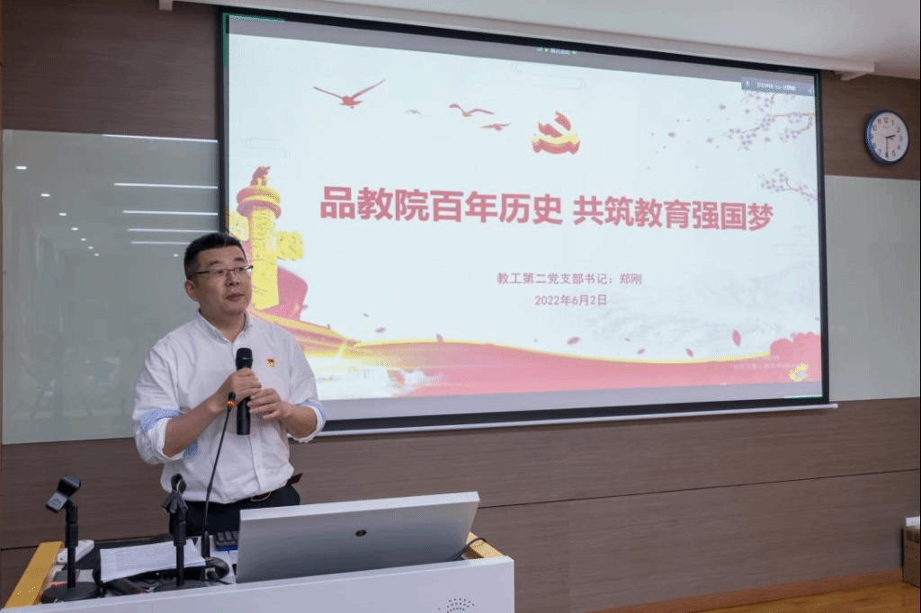 郑刚书记以“品教院百年历史,共筑教育强国梦”为主题,为2022届毕业生党员讲授“最后一堂”党课。他以学校和学院发展变迁为主线,以呈现有关历史图片为主要形式,阐明中华大学、华中大学与教育学院的渊源,讲述校史中的教育学院,带领毕业生党员回忆教育学院百年发展历程,勉励毕业生党员从校史院史中厚植教育情怀,汲取青春奋进的力量。