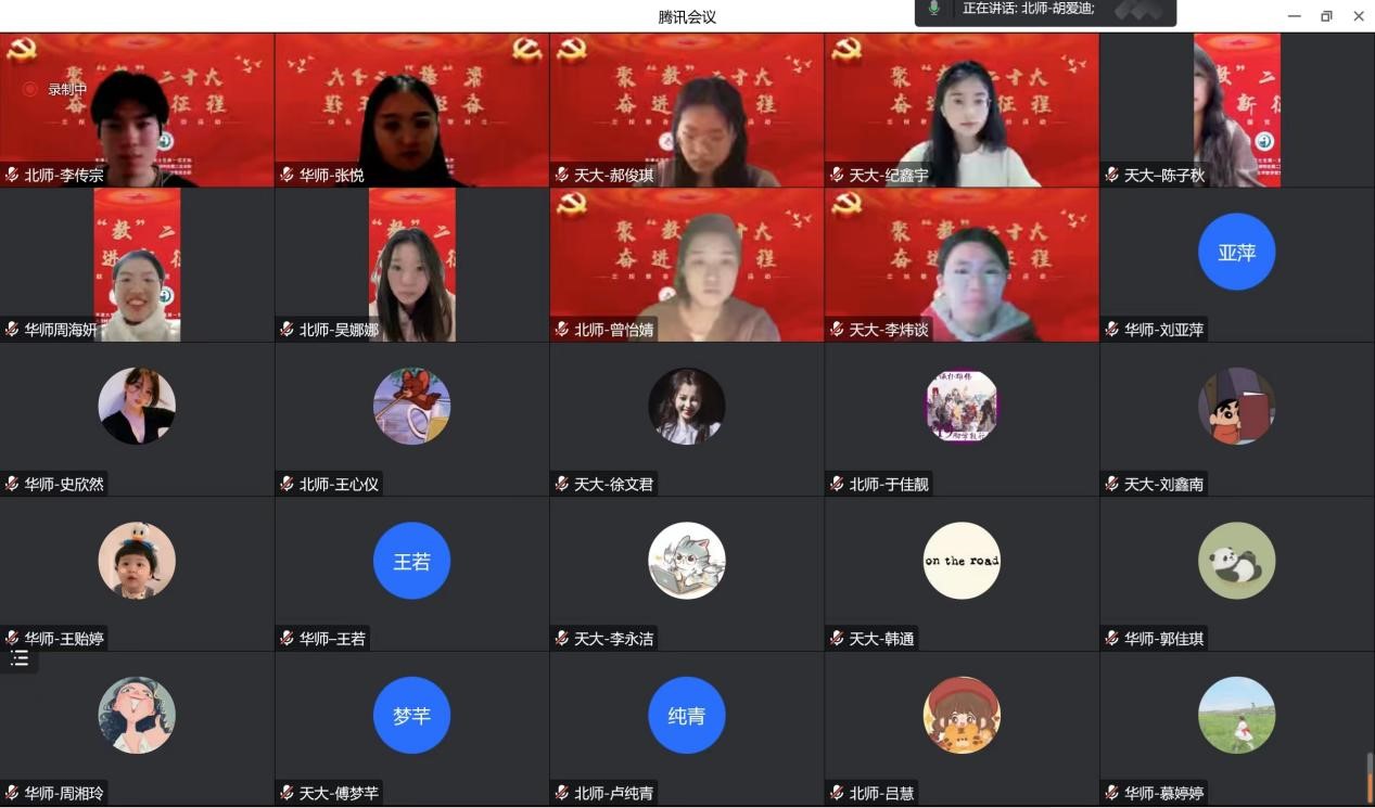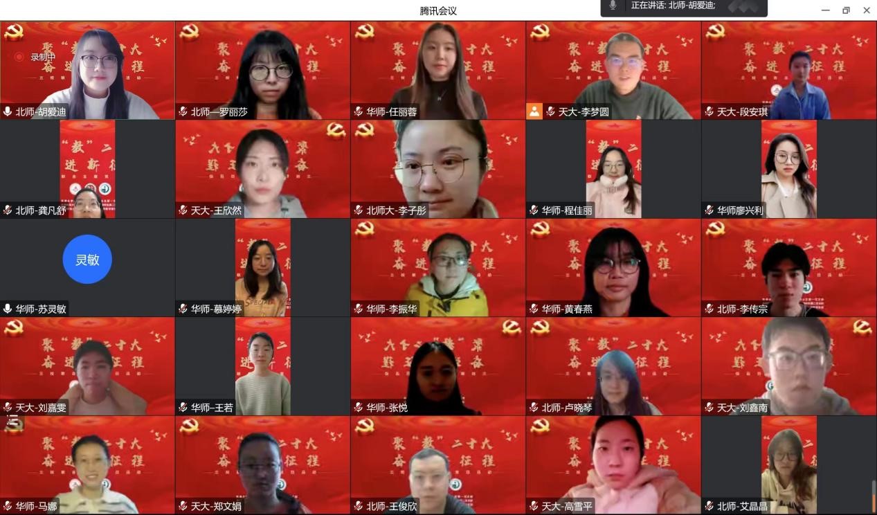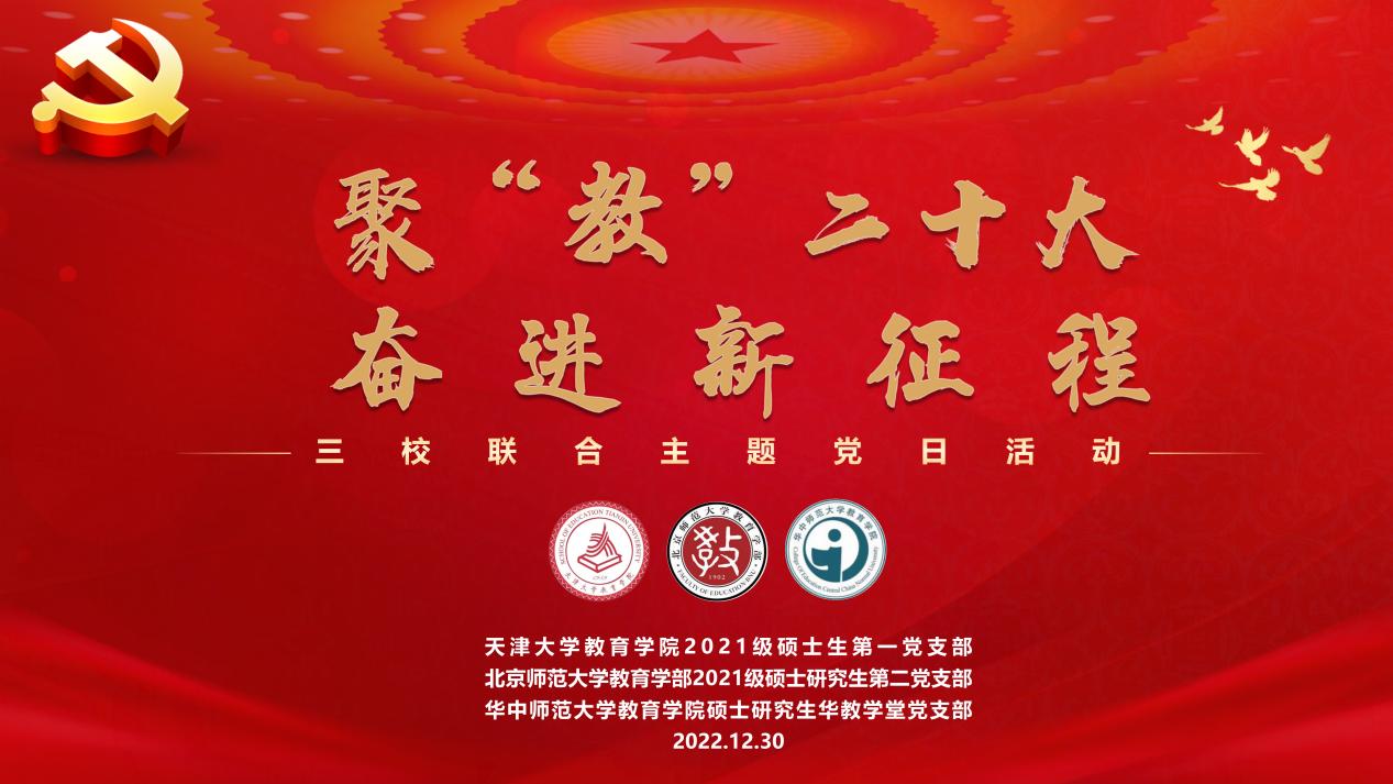 教育学院党建中心讯(通讯员 赵仁敏等)习近平总书记在党的二十大报告中勉励广大青年要坚定不移听党话、跟党走,怀抱梦想又脚踏实地,敢想敢为又善作善成。谆谆话语、殷殷嘱托,华中师范大学教育学院硕士研究生华教学堂党支部立即行动起来,联合天津大学教育学院2021级硕士生第一党支部、北京师范大学教育学部2021级硕士研究生第二党支部,于2022年12月30日线上开展“聚‘教’二十大,奋进新征程”主题党日活动。