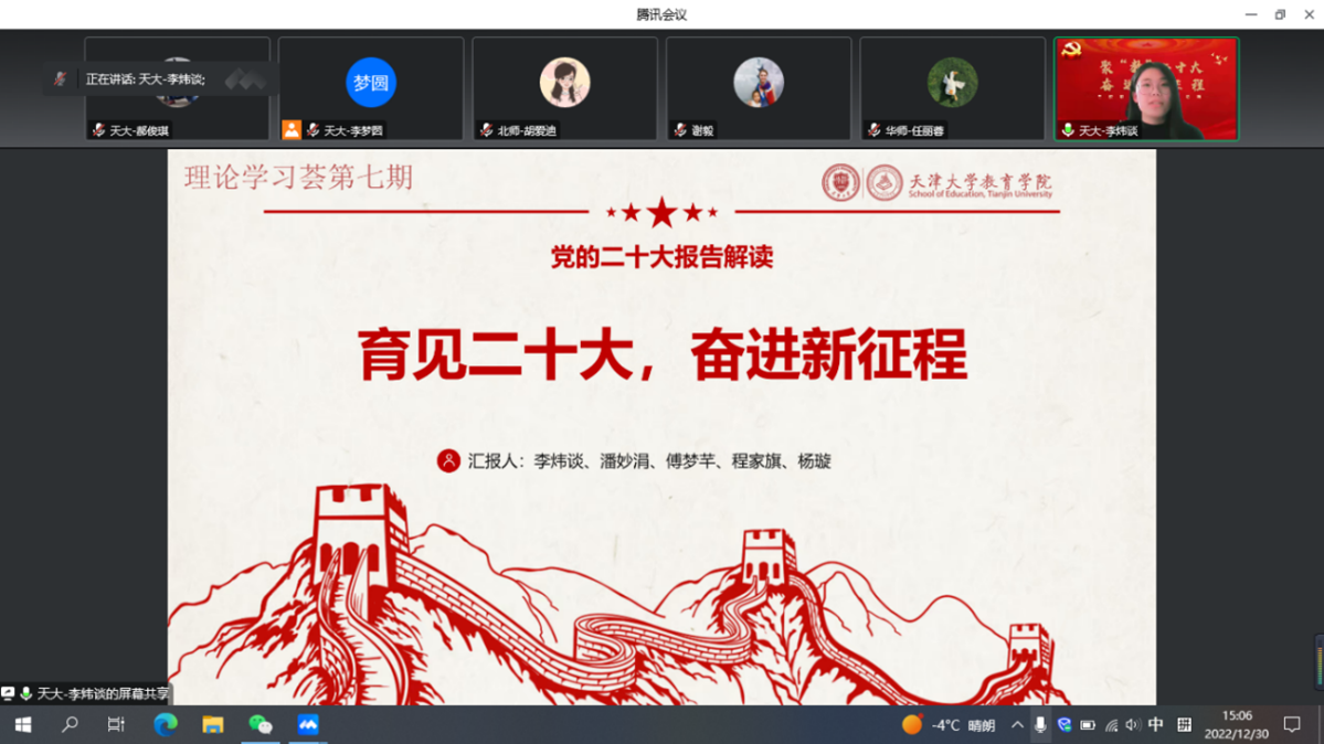活动第一项,天津大学教育学院2021级硕士生一支部的李炜谈、潘妙涓、傅梦芊、程家旗、杨璇五位同志,带来题为“育见二十大,奋进新征程”的党的二十大报告理论学习荟,带领与会成员全面系统地学习二十大报告。