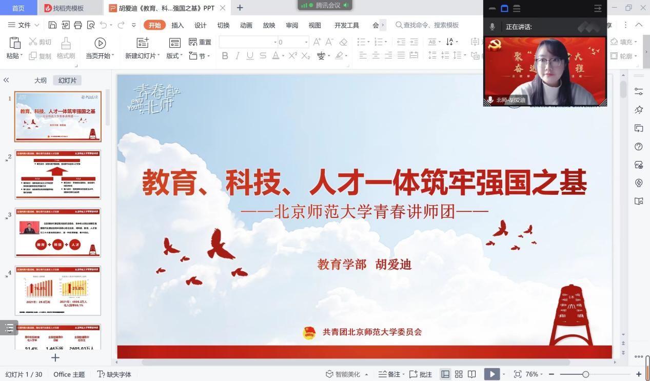 活动第二项,北京师范大学教育学部2021级硕士研究生第二党支部书记胡爱迪同志带来题为“教育、科技、人才一体筑牢强国之基”的宣讲,结合教育现实与北京师范大学的实际案例,带领参会同志领悟党的二十大对我国教育事业发展的重要意义。