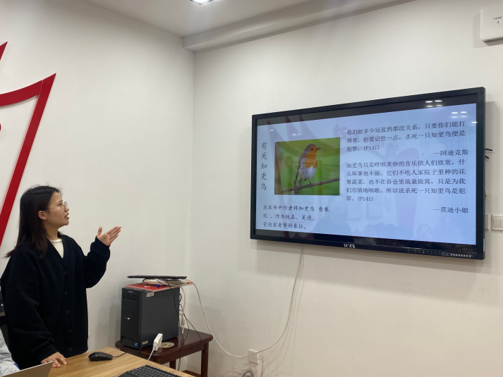 第六位分享者郑国秀同学分享的是一部美国公认的文学经典,由哈珀·李撰写的文学教育类书籍《杀死一只知更鸟》。她从作者简介、创作背景、主要人物、主要内容、个人感悟五个方面进行分享。《杀死一只知更鸟》以“斯科茨博罗案件”为蓝本进行创作,全书可以分为两个部分,第一个部分讲述了杰姆和迪尔在梅科斯特小镇与怪人拉德利发生的一些事情;第二个部分讲述的是斯库特和杰姆无意间卷入成人的世界,与父亲阿迪克斯一起帮助黑人汤姆辩护的故事。这本书只有两次提到过知更鸟,结合上下文可以知道知更鸟是纯真、美德以及受害者的象征。读完此书,她最喜欢的是阿迪克斯教育斯库特和杰姆的方式,这种言传身教将善良、勇敢、正义这些美德刻进了他们的骨子里。与拉德利相比,斯库特是幸运的,他们二人之间受到的不同教育模式也正说明了家庭教育的重要性!