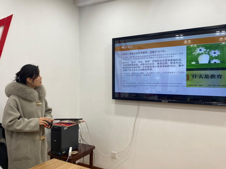 第七位分享者孙佳欣同学分享的是雅斯贝尔斯的《什么是教育》。她主要分享了雅斯贝尔斯关于教育本质、教育目的、教育内容、教育过程以及教育过程的观点,如雅斯贝尔斯认为教育不过是主体间灵肉的交流活动,包括知识内容的传授、生命内涵的领悟、意志行为的规范,并借助文化传递的功能,将文化遗产教给年轻一代,使他们自由地生成,并启迪其自由天性。她认为,当今的教育过多地关注教育对社会的贡献,对于人的精神世界的构建关注程度不够,对精神的关注应该是重于知识的传授,任何科学知识的获取都应该建立在精神导向的基础之上。