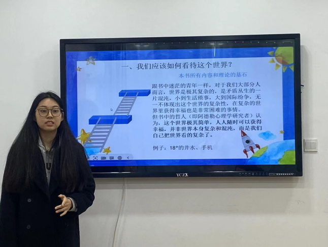 第二位分享者宋佳怡同学介绍了《被讨厌的勇气》一书。她的分享共分为三部分:第一部分主要对自我启发之父阿德勒的目的论和弗洛伊德的原因论进行对比分析,并介绍了本书的大致内容。第二部分对书中的一些经典观点进行分析,把“我们如何看待这个世界”、“我们为什么不幸福”、“什么是真正的自由”以及“我们如何才能获得幸福”等问题一一呈现,分享过程中将阿德勒心理学与教育、自我成长联系在一起。第三部分分享读书心得,她谈到人要学会自我接纳、发现身边的幸福以及拥有甘于平凡的勇气。