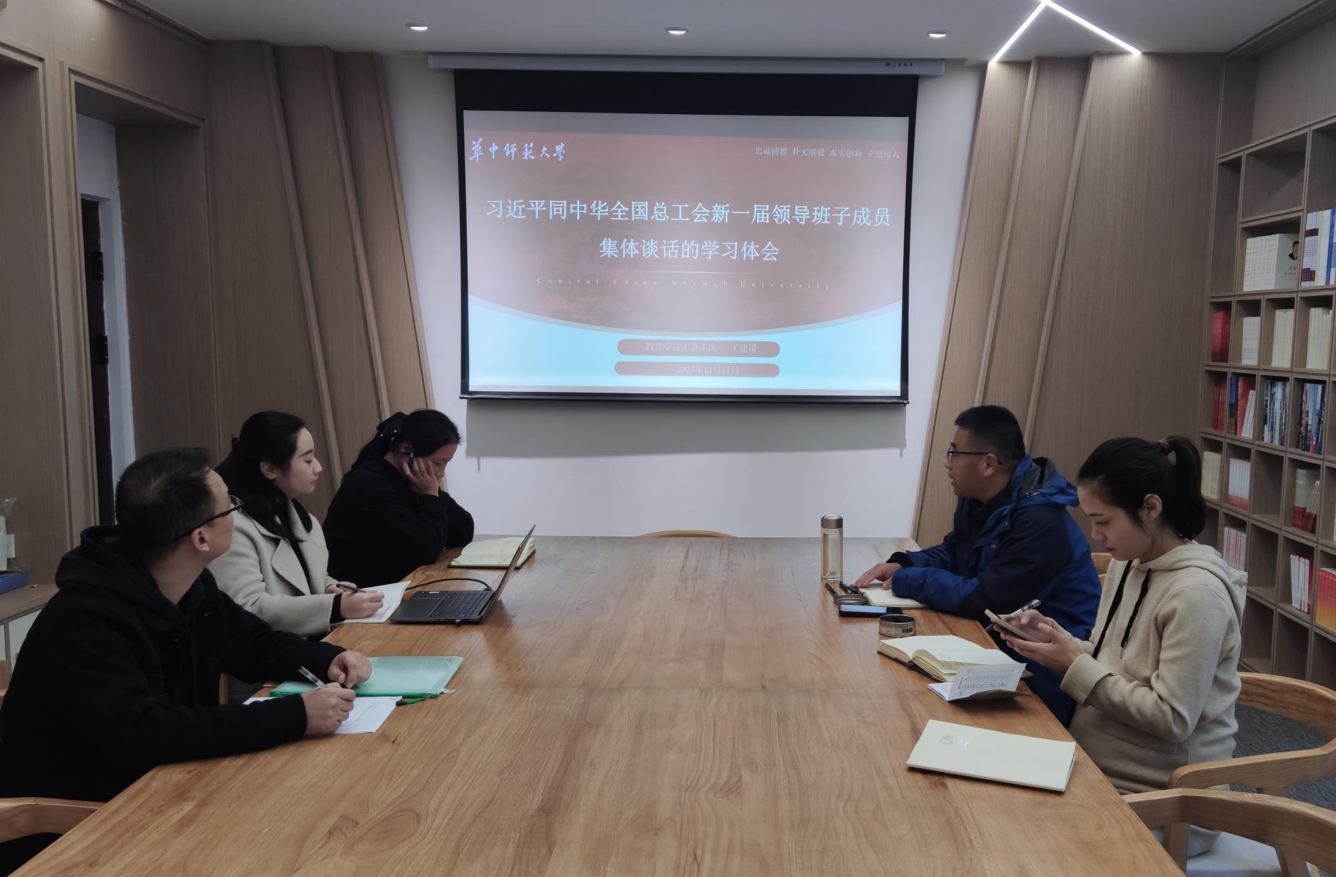 教育学院融媒体中心讯(通讯员 宫慧娜)11月27日下午,教育学院工会委员会召开专题学习会,认真学习领会习近平总书记同中华全国总工会新一届领导班子成员集体谈话时的重要讲话精神。会议由院工会主席王建梁教授主持,院工会委员会成员参加会议。