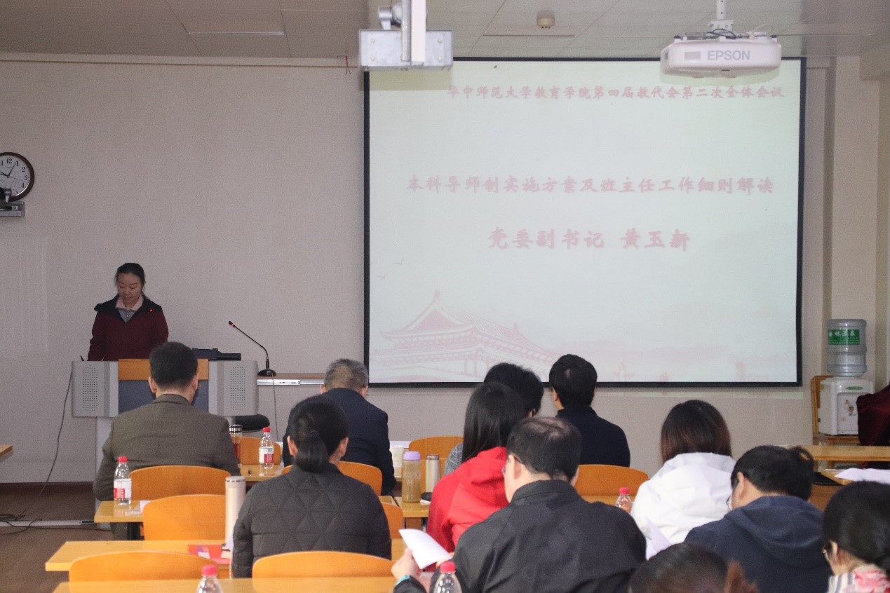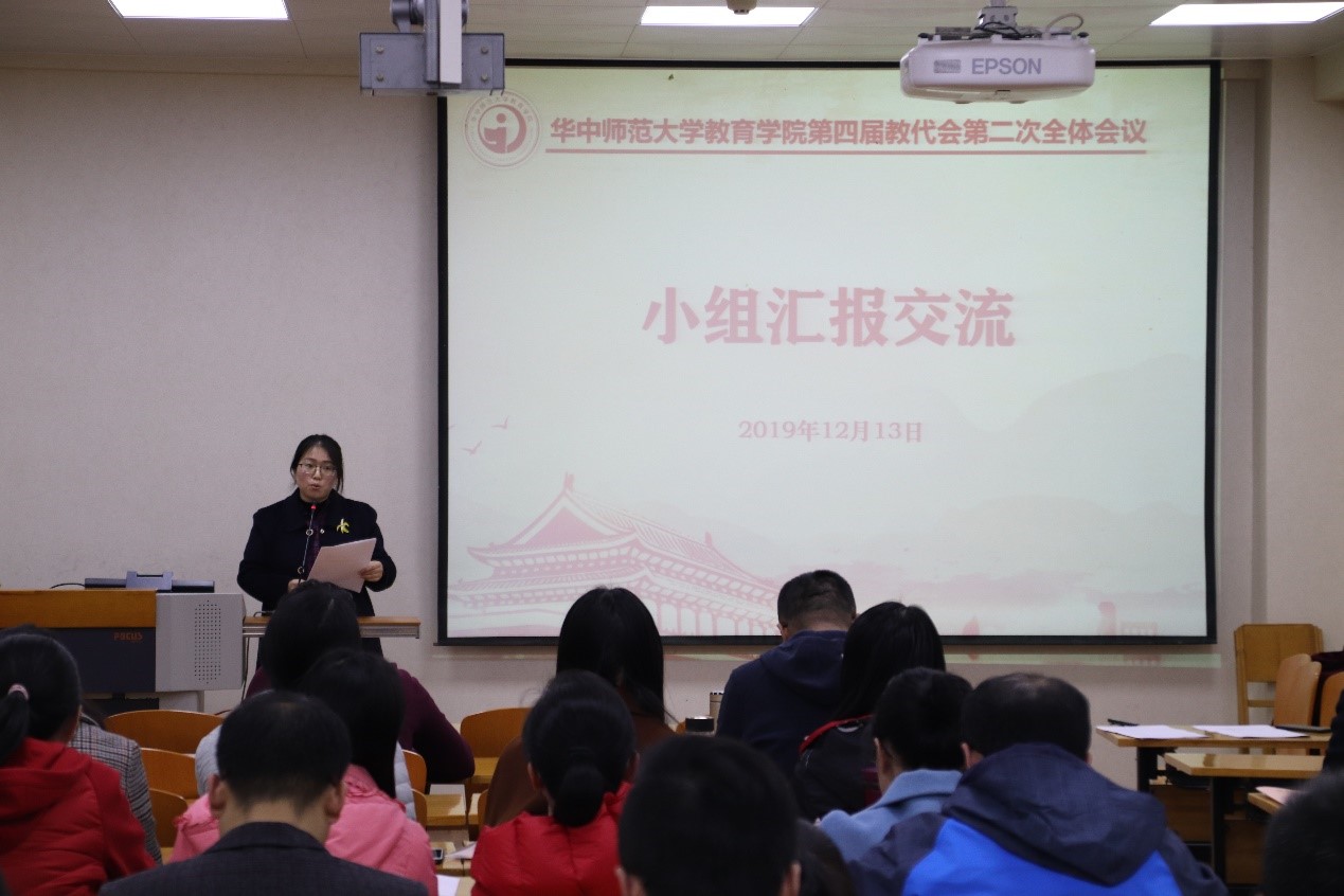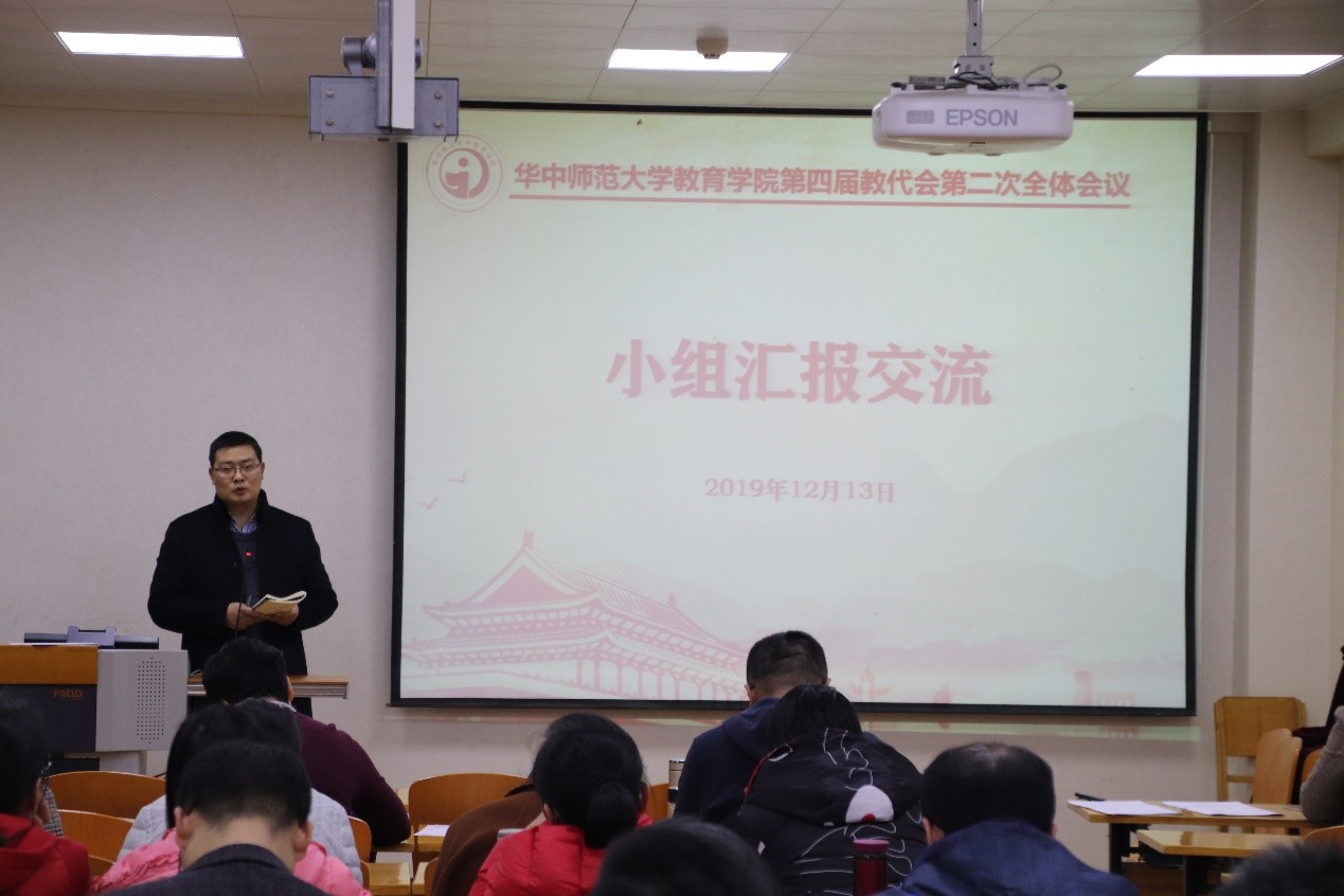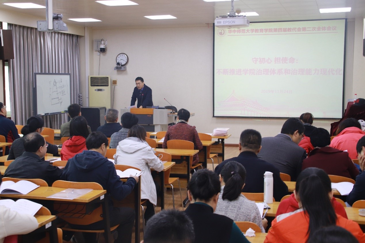 教育学院宣传中心讯(记者 焦工宣等 编辑 张萌)2019年11月24日上午,教育学院第四届教代会第二次全体会议在田家炳楼502教室举行。此次教代会以十九届四中全会精神为指导,结合学院实际,以“守初心担使命:不断推进学院治理体系和治理能力现代化”为主题,学院党政领导、全体教职工参加了会议,会议由副书记张扬主持。此次教代会在形式上进行了创新,整个会议分为两个阶段,11月24日上午的第一阶段会议进行相关工作报告,期间由小组长主持讨论,广泛听取、收集职工意见,于12月13日下午进行大会交流发言。