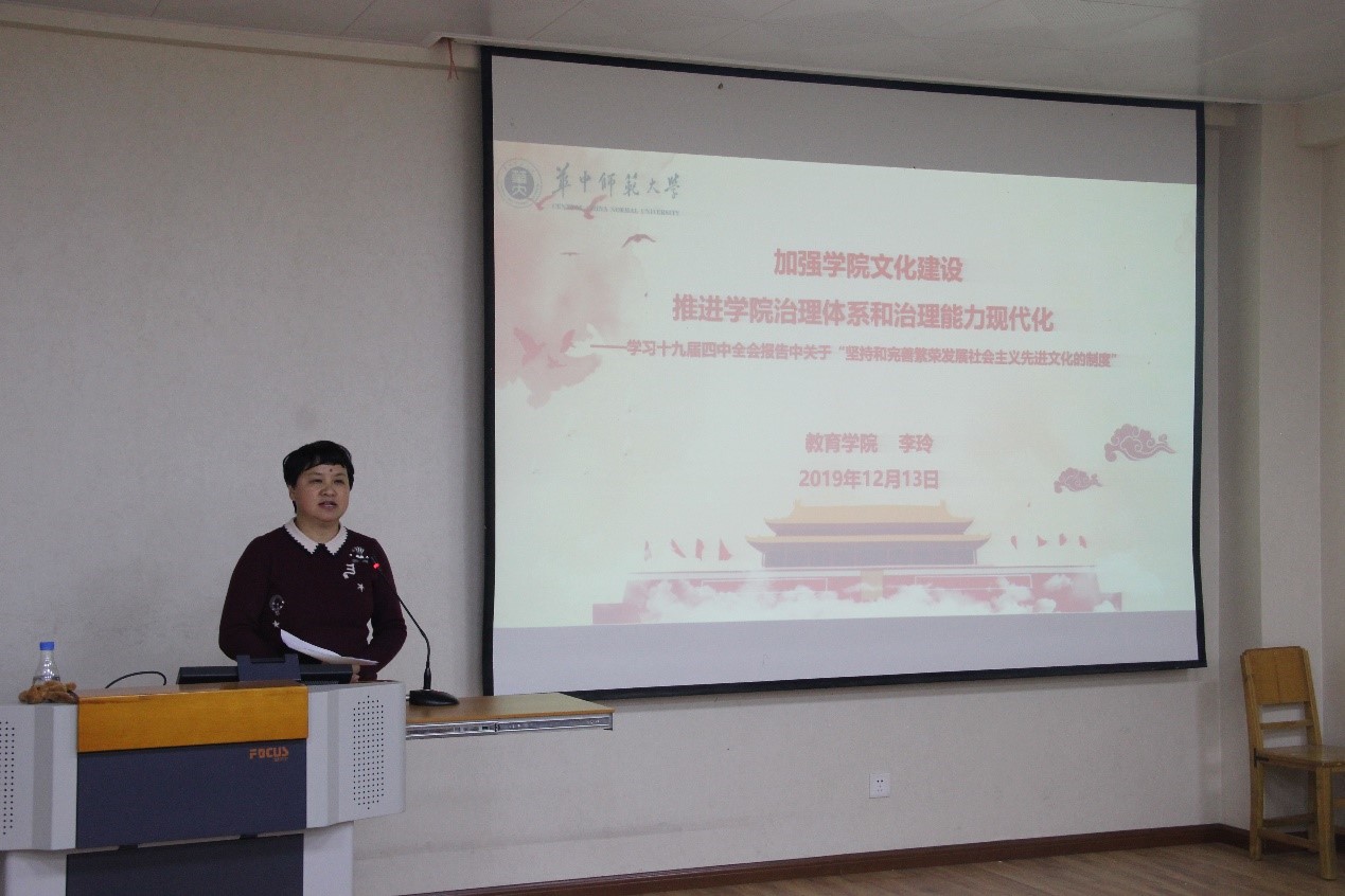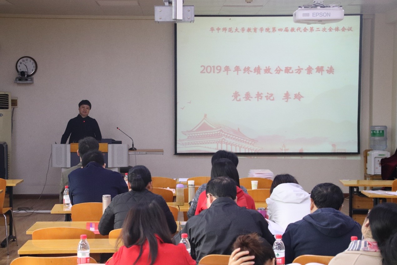 党委书记李玲把总结讲话与十九届四中全会精神的宣讲有机结合在一起。她先是简要介绍了十九届四中全会的基本情况,接着分四个方面围绕“加强学院文化建设推进学院治理体系和治理能力现代化”进行了汇报。她表示文化建设是学院治理的根基,今后将把学院文化建设作为重要任务来抓,并提出了具体思路。最后,她表示,此次教代会很成功,学院班子将召开专题会议梳理教职工的意见和建议,以制度建设为抓手,以文化建设为依托,守初心担使命,不断推进学院治理体系和治理能力现代化,把教育学院推向更为光辉灿烂的明天。