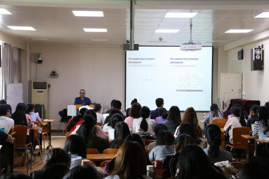 首先,Ellis教授和大家一起回顾了前两堂课的主要思想内容,为课堂的顺利进行打下了基础。随后他向我们介绍了不同的教师发展的研究构思,阐明了用简单思维和复杂思维看待教师发展的异同。Ellis教授指出,在英国,教师发展与新自由主义息息相关,这种简单观点下形成的市场驱动式教师发展存在诸多弊端。而CHAN理论正是一种复杂思维,能够在教师发展的问题上给我们诸多启示。在讲授的最后,教授向我们分享了两段教师教育培训机构的相关视频,视频之后,课堂进入了热烈的讨论环节。