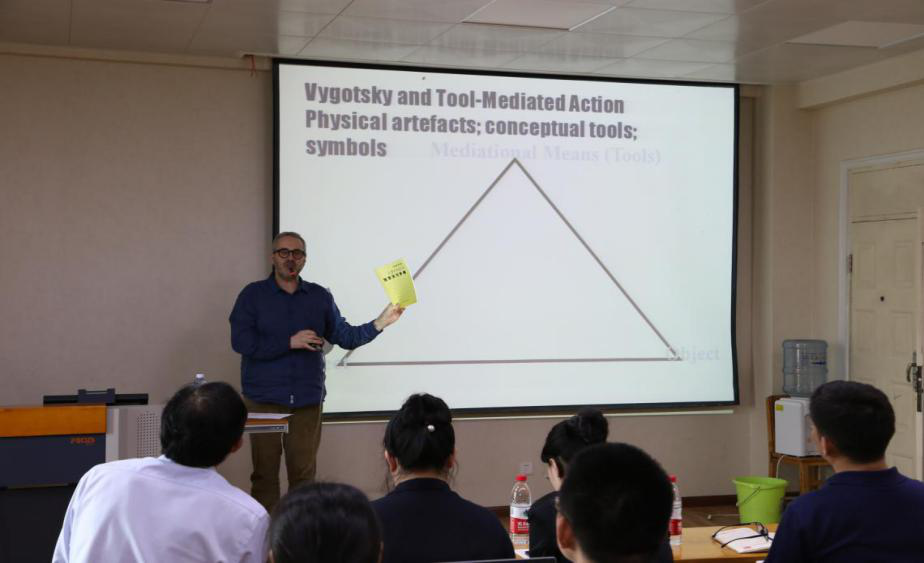 本堂课在前两日的研讨基础上继续深入,课堂分为教授讲授和小组讨论两个部分。课程主题是“研究教师发展:学会教学”,英国国王大学Ellis教授带领大家对CHAT(文化历史活动理论)的应用进行了深入浅出的分析和解读。
