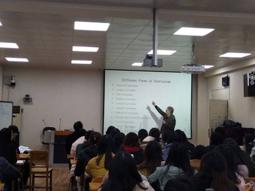 第一场讲座伊始,Schubert教授列举了教师进行课程理论设计时应该思考的主要问题,包括什么最值得知道、经历、需要、分享等。Schubert教授认为明确这些首要问题,才能更好地展开课程理论设计。随后,Schubert教授依次介绍了空无课程、隐性课程、学习课程、应用课程、考试课程、文化课程、“BIG”课程等课程范式的内涵,以及一些国际前沿课程范式在国外的发展现状。其中“BIG”课程是由Schubert教授首创的一种课程范式,他认为教学课程也会受到政治和商业等的影响。接着Schubert教授用角色扮演的方式生动幽默地向学生展示了各个课程范式的基本特点、核心问题以及研究方式。他强调,课程设计的视角和方式并非单一的、固定的,作为一名教师,不应该拘泥于一种流派,而应该根据学生的特点,有针对性地融合不同流派的优点,采用多种视角,探索多种可能性。