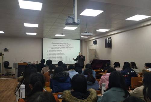 (通讯员:张静玉 摄影:董玲雪 编辑:陈棋)2018年12月19日下午,研究生高水平国际化课程《课程范式、视角和可能性》第二讲在田家炳楼502开课。本次课程依旧由美国著名课程论专家Professor Schubert 主讲,由Professor He 担任翻译。教育学院毛齐明副教授全程主持本次讲座,我院欧阳光华老师、高巍老师及100多名研究生参与了课堂学习和交流。