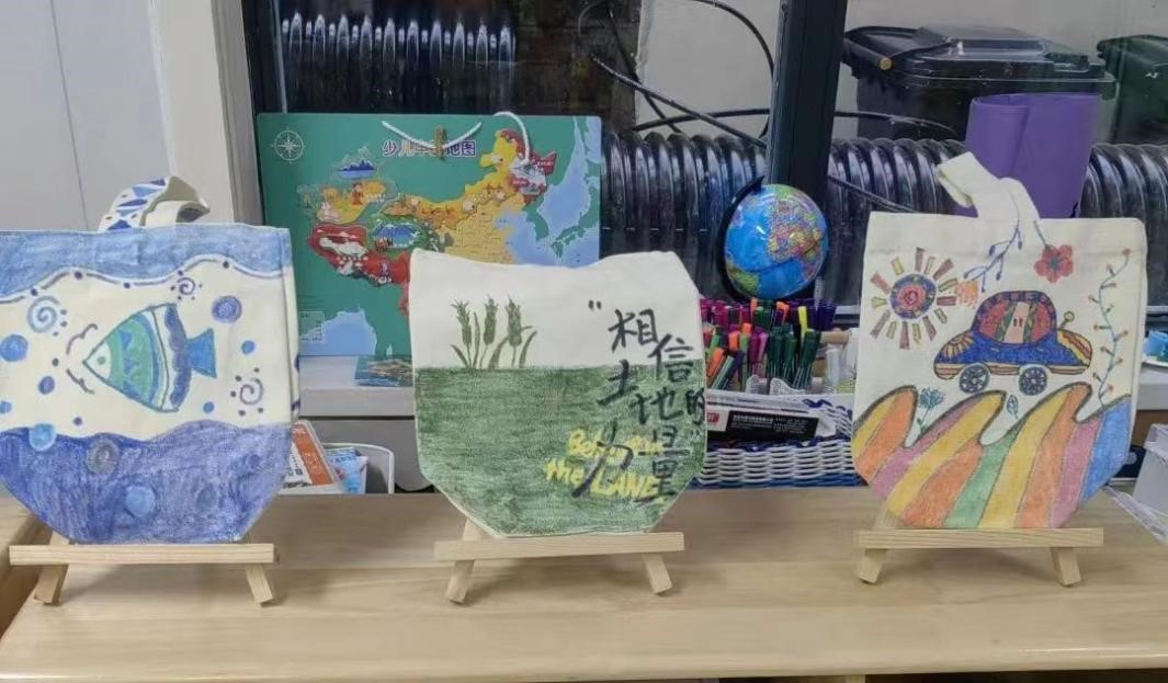 大一班组织了手绘帆布袋的班级活动。实习生张别韵和邱晓琪在活动前期制作了活动展板,绘制了四个示例帆布袋;在活动过程中积极帮助其他老师维护活动现场的秩序,帮助家长及小朋友们记录温馨的瞬间,后期将帆布袋送至图书馆进行展台布置;在活动结束后帮助老师们清理活动现场。