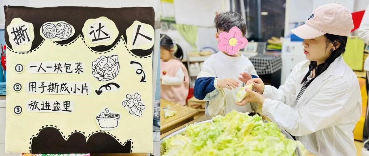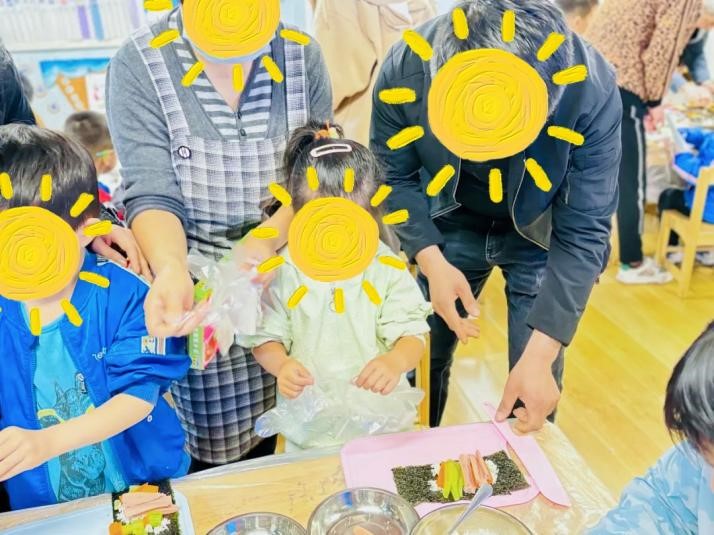 中三班组织了“制作紫菜包饭”的劳动活动,让幼儿能和家长一起体验劳动的乐趣。实习老师谢知珂在活动前期动手制作了活动宣传板,在活动当天一早便参与活动准备工作。与其他老师一起开始摆桌子、铺桌布和准备食材,将米饭蒸熟,胡萝卜和黄瓜焯水后和火腿肠一起切丝,并把紫菜等食材进行摆盘,接着给每桌准备竹帘、案板和安全刀具,至此准备工作完成。随后他们组织家长有序进入班级,进行简单的说明和示范后,家长和幼儿就可以一起变身小厨师开始制作美味的紫菜包饭啦。
