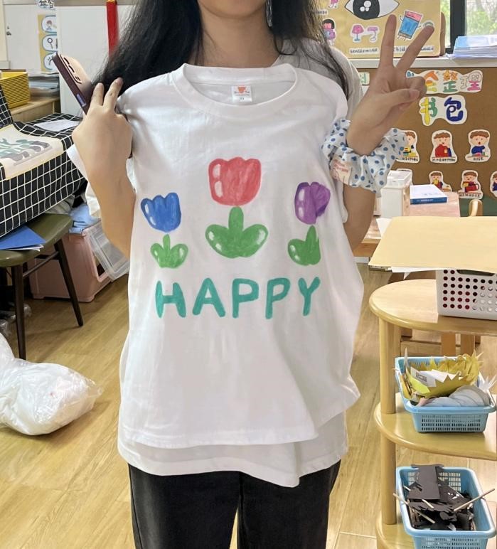 在“劳动集结令”的号召下,大二班进行了手绘T恤的制作。设计T恤本着环保、创新的理念,让每个孩子和家长都使用他们手中的画笔,绘出他们心中美丽的图案。实习生程亚楠、仁青娜么还为每一个小朋友进行了合照留念,帮她们留下了自己最童真的笑容。