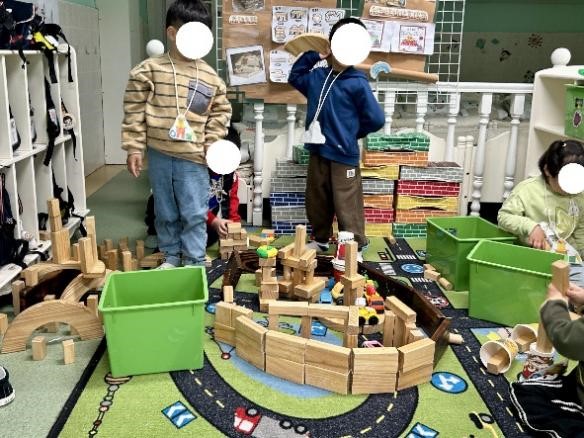 在新闻广播舱中,老师会准备相应的适合幼儿阅读的新闻内容,男孩女孩搭档组合,模仿新闻联播进行播报,在游戏过程中,促进了幼儿认知及语言方面发展。在拼乐岛中幼儿根据老师的主题要求,构想设计图并自由组队,自由选取材料,例如原色积木、纸杯、扑克牌,争当小小建筑师。