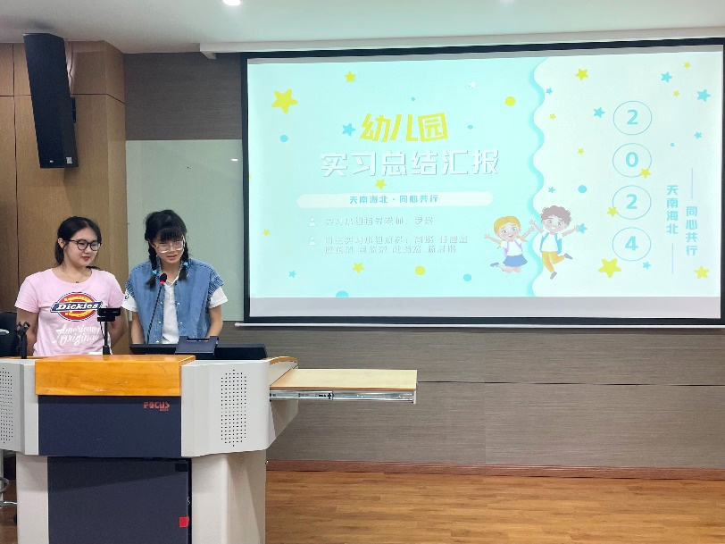 总结大会上,各个实习小队的代表就实习期间的成果、收获和问题进行总结与分享,从日常的保教工作到丰富的特色活动、从师幼互动体验到家园活动参与、从尝试教研活动到独立开展调研,全面地展示了各个幼儿园的特色与多彩的实习经历。
