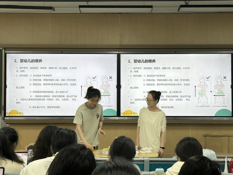 之后,顾琳为同学们科普了针对低龄段婴幼儿的海姆立克急救技术,总结道不同的照料内容需要关注婴幼儿的不同需求、选取不同的姿势以保证婴幼儿安全和舒适,照料者应根据婴幼儿的身心状态调整进程和动作。