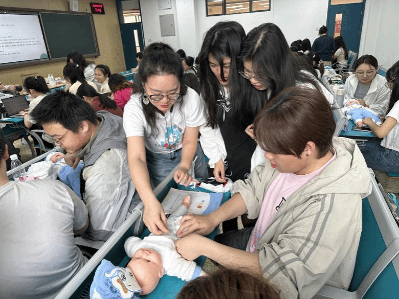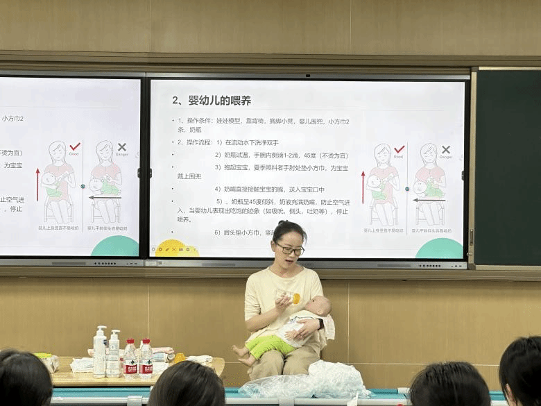 进入实操模块,顾琳将教学内容分解为喂养、沐浴、抚触、急救四大技能板块。在喂养技能教学中,她手持仿真婴儿模型,分步演示拍嗝手法、奶瓶角度控制等要点。随后,顾琳组织学生使用实训工具分组实操演练或上台展示,针对操作过程中出现的细节问题进行现场指导与动作矫正,帮助学生扎实掌握婴幼儿照料的基础实操技能。