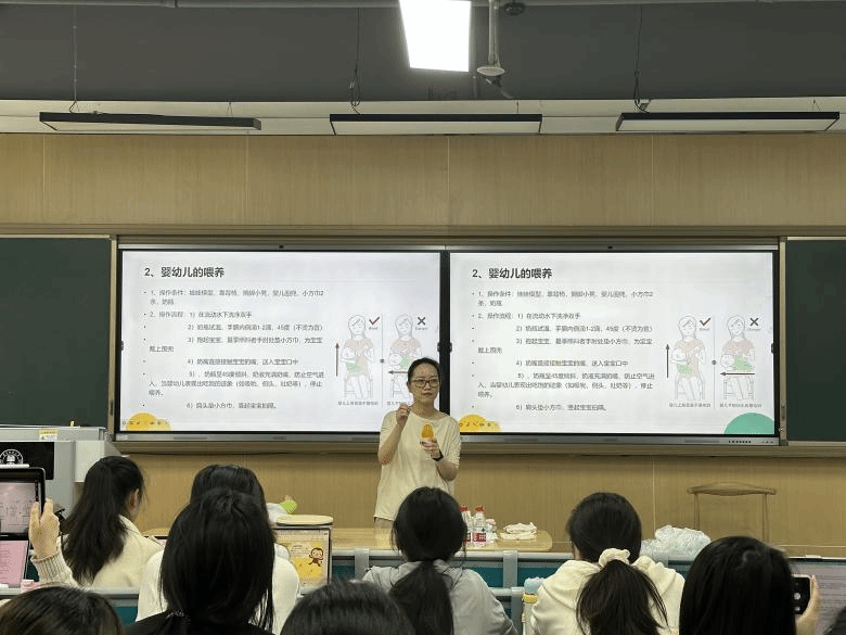 在理论教学中,顾琳结合婴幼儿身心发展特点,阐释 "婴幼儿照料" 概念并强调科学照料对其身心发展的关键作用,指出回应式照护是从业人员应掌握得职业基本功,能帮助婴幼儿构建安全感。