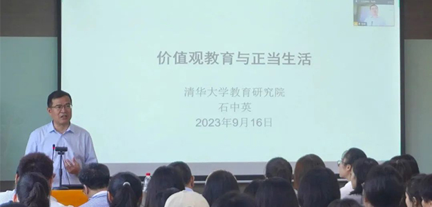 On 16th September, at the invitation of the Institute of Moral Education and the Education College at Huazhong Normal University, Professor Zhongying Shi, Dean of the Institute of Education at Tsinghua University, gave a lecture at the Institute of Moral Education. Professor Lei Wanpeng from the Graduate School, Chen Xueling, Secretary of the Party Committee of the School of Education, Deputy Secretary Su Chunyan, Vice Dean Professor Lei Jianghua, Professor Pu Rui, Professor Luo Zubing, Professor Dai Weifen, and Professor Du Shizhong, Director of the Institute of Moral Education, Professor Cheng Hongyan, Deputy Director of the Institute, Associate Professor Lu Xu, Associate Professor Zhang Tianyi, and Associate Professor Sun Yinguang, and others, attended the meeting. Over a hundred students also attended the meeting. The lecture was held in Room 905 of Tian Jiabing Education Building, and a branch venue was opened in Room J502.