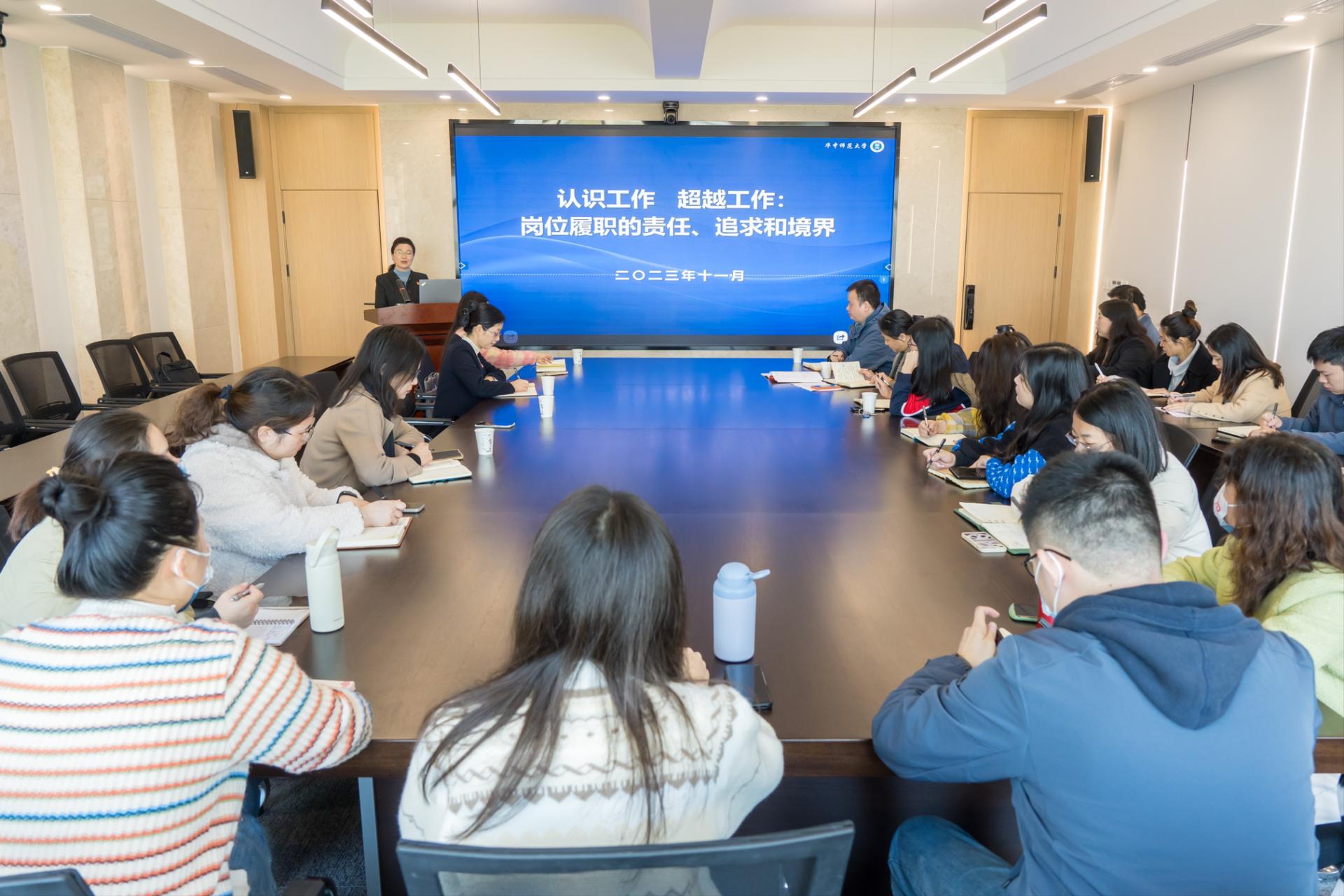 教育学院融媒体中心讯(通讯员 胡力扬 刘馨雨) 为引导广大党员教师始终保持统一的思想、坚定的意志、协调的行动、强大的战斗力,强化党员教师队伍服务意识,践行服务育人理念,11月16日上午,教育学院教工第四党支部(行政教师党支部)邀请院党委书记陈雪玲以“认识工作 超越工作:岗位履职的责任、追求与境界”为题讲授专题党课。院党委副书记苏春艳、王璐,教工第四党支部全体党员以及学院行政教辅人员参会交流,会议由教育学院教工第四党支部书记谭颖芳主持。