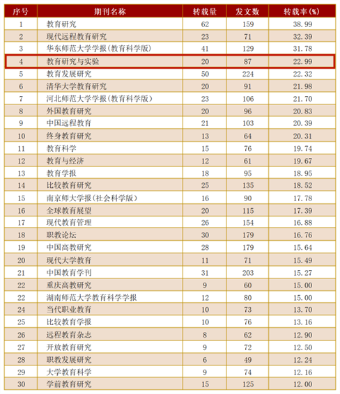 教育学院融媒体中心讯(通讯员 谭颖芳)2024年4月25日,中国人民大学复印报刊资料转载指数发布暨中国自主知识体系建构与学术期刊发展研讨会在北京召开。会上,《复印报刊资料转载指数研究报告(2023)》《复印报刊资料重要转载来源期刊(2023年版)》正式发布。《教育研究与实验》2023年度发文87篇,被人大复印报刊资料学术系列期刊全文转载20篇,转载率为22.99%,在全国教育学期刊转载率排名中位列第四,并继续入选“复印报刊资料重要转载来源期刊”。