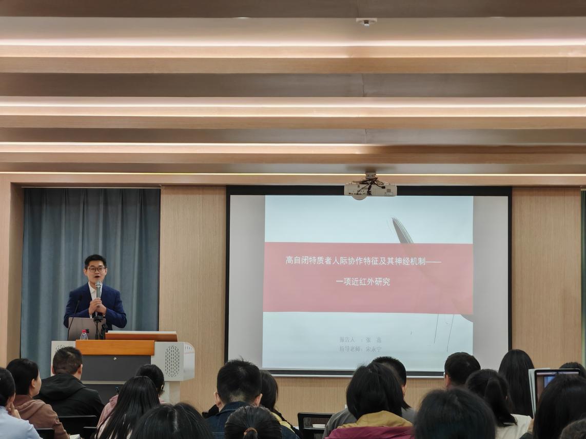 张鑫以近红外成像技术的应用为切入点,对近红外的定义,近红外技术的原理、特点、应用、研究领域现状以及近红外成像技术与自闭症研究趋势进行了简介。在自闭症人群人际协作部分,通过核心概念界定以及文献综述,张鑫发现自闭症谱系障碍人群的人际协作存在以下两种特点:ASD 群体在人际互动过程中,相对于正常人群表现出比较差的运动同步性;儿童在自闭症诊断观察表的得分越高则在互动任务中表现出的同步性越少,互动同步性和儿童的智商没有关系。在高自闭特质者人际协作部分,张鑫介绍了高自闭特质研究现状,并在此基础上进行文献综述,确定研究框架与研究假设:人际协作任务中,高自闭特质组的协作表现要显著差于对照组;高自闭特质组被试的脑间同步性要低于对照组。通过近红外研究技术与多种研究方法的运用,实验后得出行为学结果及脑间活动同步性结果。在讨论与展望部分,张鑫不仅指出了研究的创新之处、研究启示、研究不足,同时,张鑫也拓展介绍了相关研究的成果,指出脑间活动同步性存在的争议,并对未来研究进行展望。