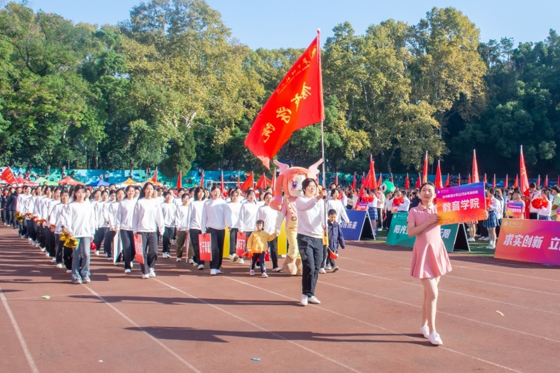 教育学院融媒体中心讯(通讯员 李珂瑜 张添凯等)10月31日至11月2日,华中师范大学2024年运动会隆重举行,教育学院教职工积极参与开幕式与教工项目。开幕式上,教职工们身穿白色、黑色外套,手持红旗,紧随学生表演方针齐步行进,学生们手举写有“教育家精神”六个方面的红色牌匾,师生共同呈现了积极进取、奋发向上的精神风貌。