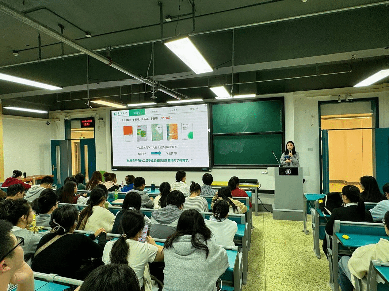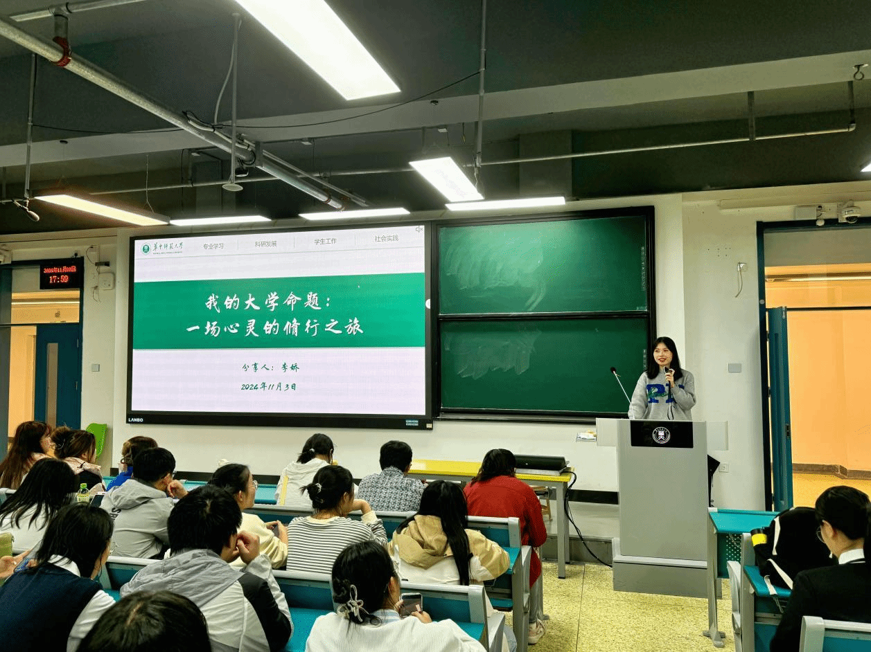 教育学院融媒体中心讯(通讯员 魏银莉)11月3日,教育学院2023级本科生“师吾长技”分享会在八号楼8310教室举行。我院2021级学前教育专业本科生李娇担任本期主讲人,她以“我的大学命题:一场心灵的修行之旅”为主题,从专业学习、科研发展、学生工作、社会实践四个方面向全体本科生作经验分享。