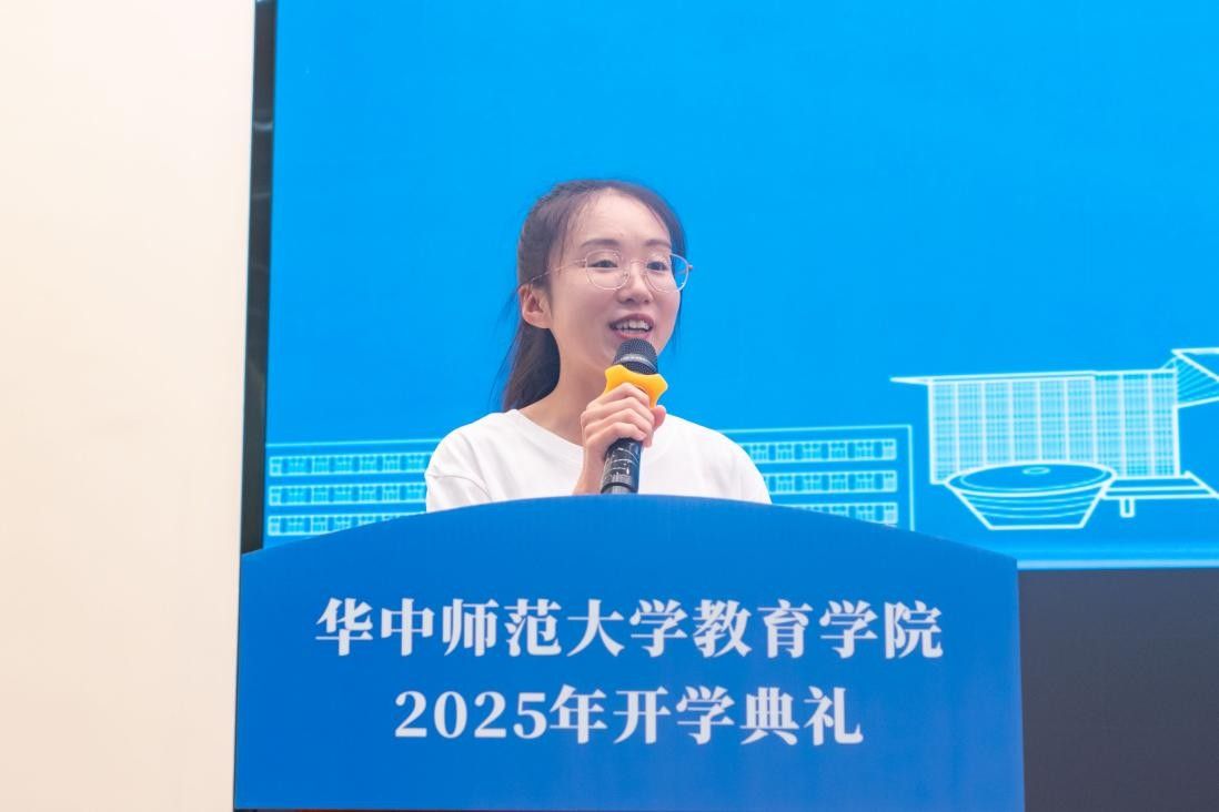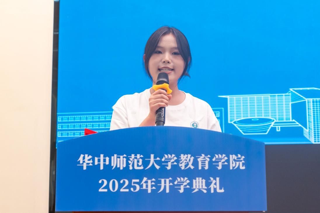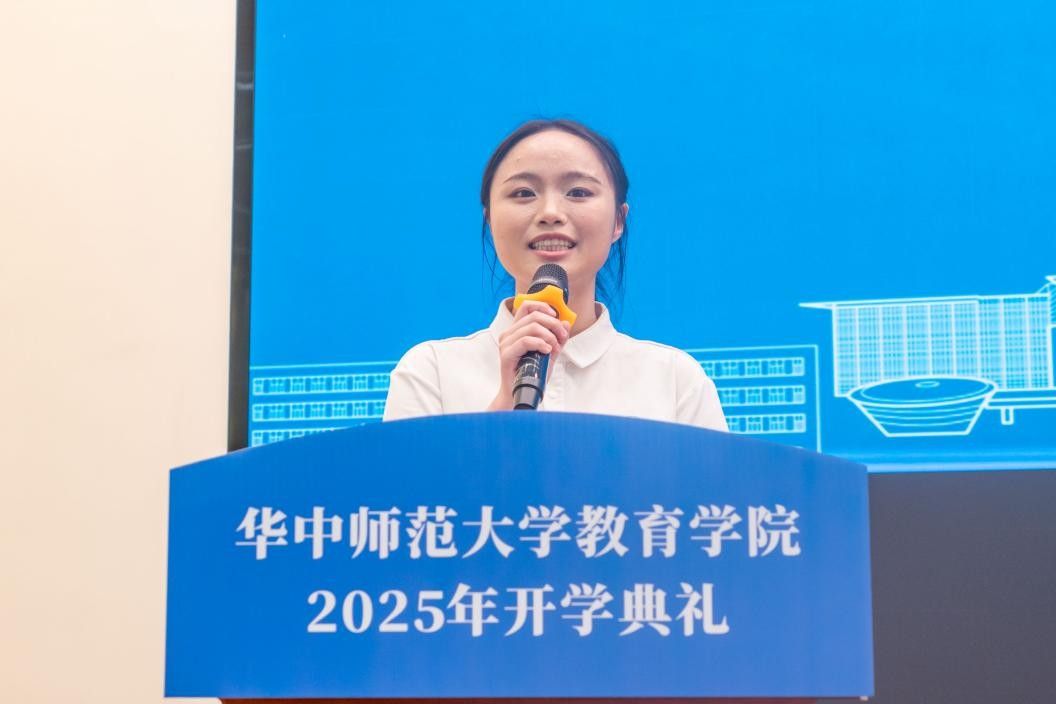 本科新生代表钟瑜婷分享了自己选择教育学专业的初心和对教育的感悟。她代表新生表示将以前辈们为榜样,践行教育报国初心,在实践中打磨本领,让创新服务于教育实践,在教育之路上奋勇前行。