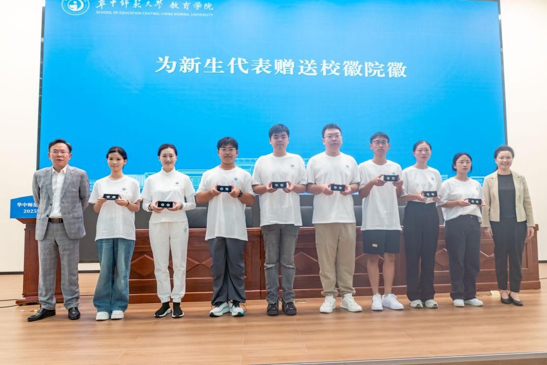陈雪玲、杜时忠为新生代表赠送校徽院徽,激励新生传承学校和学院历史底蕴与文化追求,在学术与育人的道路上砥砺前行,不负学校和学院的殷切期待。
