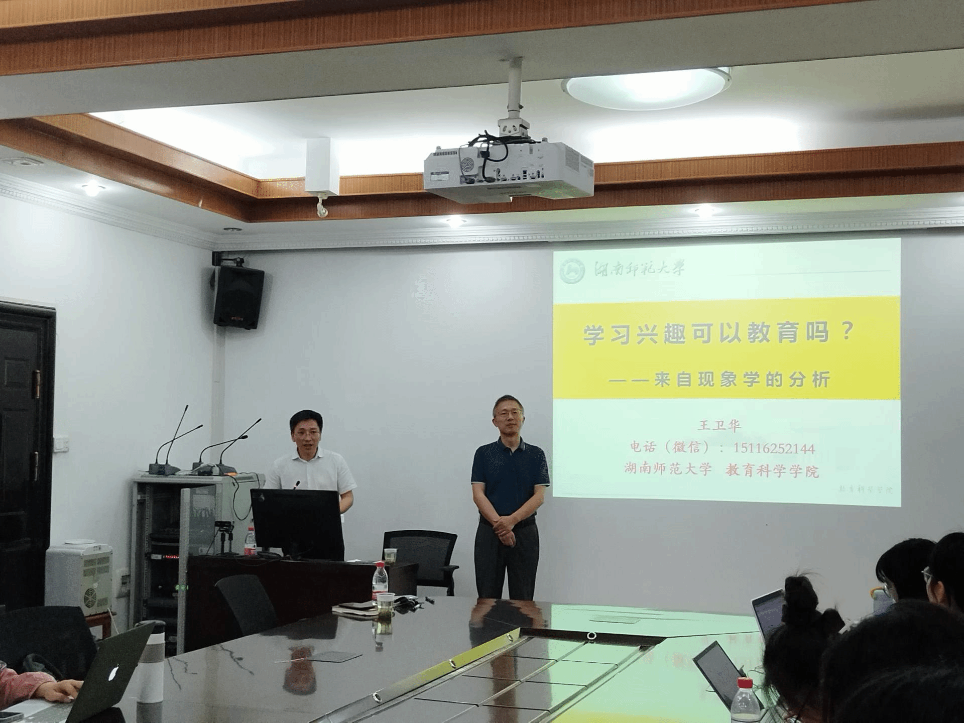 教育学院融媒体中心讯(通讯员 邱丽 吴必园) 2023年5月19日晚6:00,教育学院第五十五期“博导论坛”在教育学院624会议室顺利举行。本次论坛由湖南师范大学教育科学学院的王卫华教授主讲,报告题目为《学习兴趣可以教吗?——来自现象学的分析》。论坛由教育学院课程与教学所所长罗祖兵教授主持,教育学院的博士研究生、课程与教学论专业、小学教育专业的部分硕士研究生等共30余名同学参加了此次学术报告会。