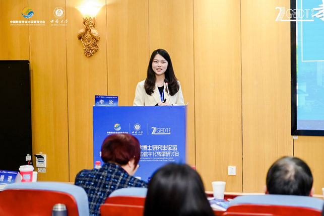 16日上午,比较教育学专业博士生李欢与其他高校五位博士生在“博士生大会报告”作主论坛报告,她聚焦“国际教师数字素养提升路径的过程要素”和“国际教师数字素养提升的实践路径”两个问题,通过对教师数字素养提升项目的比较分析,提炼其共性特征,并提出我国教师数字素养的提升路径。