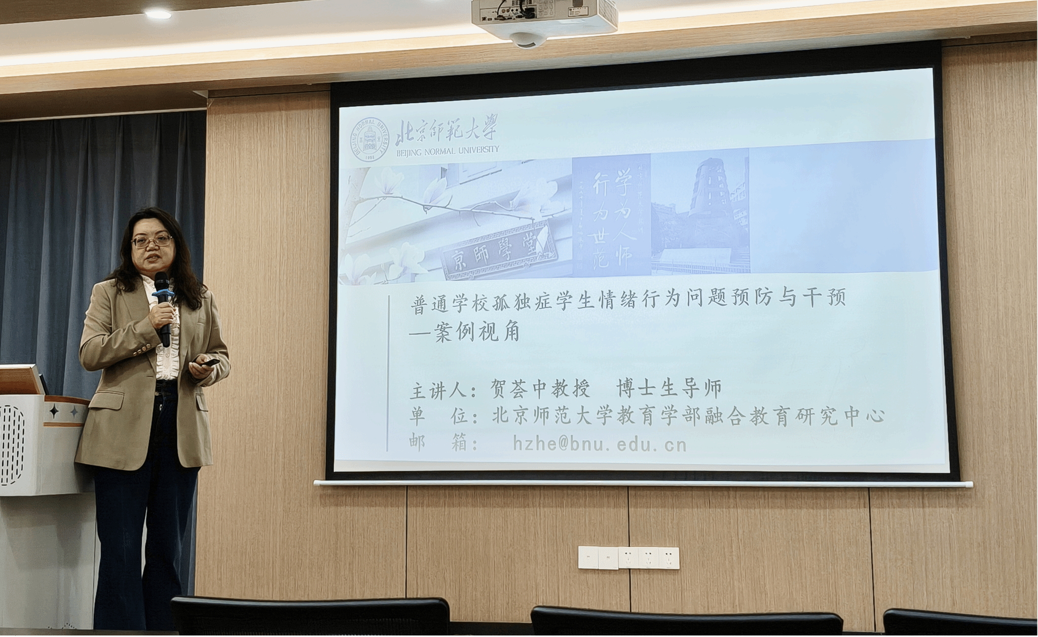 论坛伊始,贺荟中先厘清“自闭症”与“孤独症”的名称差异及表述准确性,引导现场师生深入思考孤独症谱系障碍的核心特征。为让理论阐释更易理解,她分享了近期在北京市昌平区两所小学指导随班就读工作的实践案例,强调掌握孤独症行为干预技能的现实必要性。