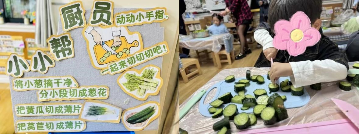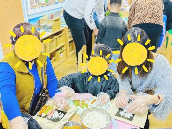 中三班组织了“制作紫菜包饭”的劳动活动,让幼儿能和家长一起体验劳动的乐趣。实习老师谢知珂在活动前期动手制作了活动宣传板,在活动当天一早便参与活动准备工作。与其他老师一起开始摆桌子、铺桌布和准备食材,将米饭蒸熟,胡萝卜和黄瓜焯水后和火腿肠一起切丝,并把紫菜等食材进行摆盘,接着给每桌准备竹帘、案板和安全刀具,至此准备工作完成。随后他们组织家长有序进入班级,进行简单的说明和示范后,家长和幼儿就可以一起变身小厨师开始制作美味的紫菜包饭啦。