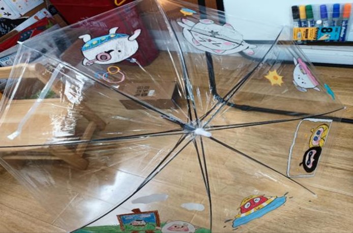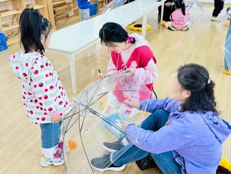 中一班在此次活动中承担任务是绘制雨伞。实习生何小蝶负责协助小朋友和家长们在透明雨伞上用马克笔画出可爱的图案,引导他们进行亲子合作,创作出独一无二的小雨伞。绘制结束后,她将这些充满童真童趣的雨伞送往图书室布展,将小朋友们的成果拍照记录,为他们留下难忘的美好回忆。