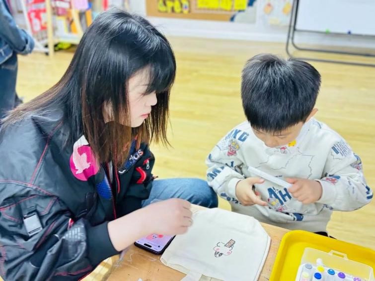 大一班组织了手绘帆布袋的班级活动。实习生张别韵和邱晓琪在活动前期制作了活动展板,绘制了四个示例帆布袋;在活动过程中积极帮助其他老师维护活动现场的秩序,帮助家长及小朋友们记录温馨的瞬间,后期将帆布袋送至图书馆进行展台布置;在活动结束后帮助老师们清理活动现场。