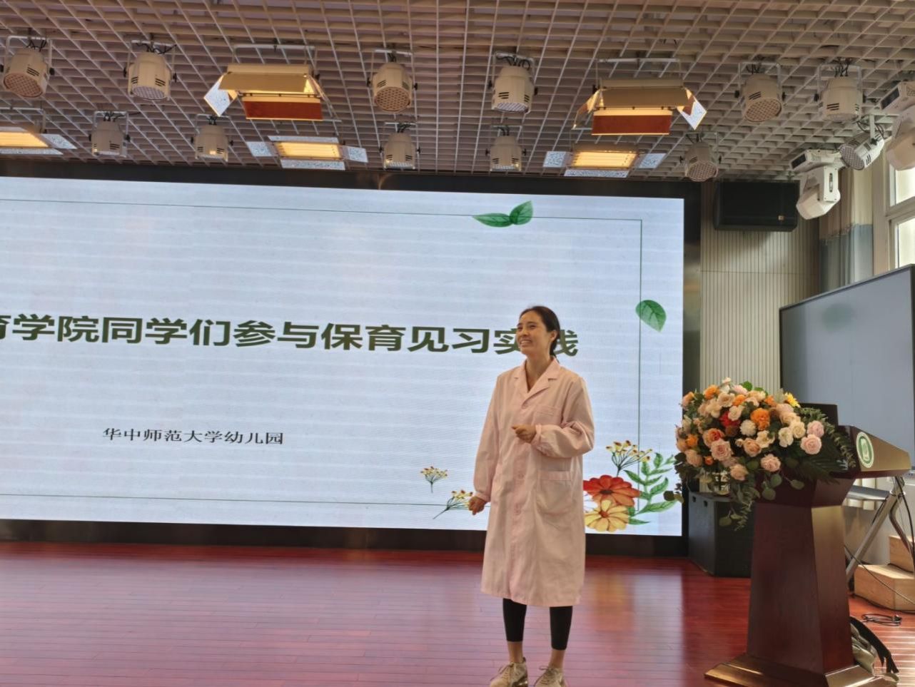最后,全体同学集中前往幼儿园会议室,倾听卫生保健主任为大家带来的保育健康专题分享。分享围绕幼儿园日常卫生管理、传染病预防、营养配餐及突发状况处理等核心内容展开,帮助同学们将课堂所学与幼儿园实际工作有效衔接。
