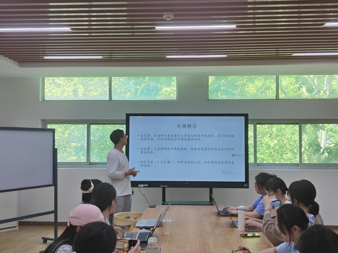 活动伊始,宗清瑶介绍活动背景、主讲人以及到会教师。随后,本次活动的主讲人2023级学术型博士生金星围绕本次活动主题进行分享。讲座共分为六个部分,即实验法的发展历程、实验法的优缺点、实验法中的关键概念、特殊教育研究中常见的实验设计、特殊教育实验选题、特殊教育实验整体展示。在实验法的发展历程方面,金星介绍了十九世纪末之前-至今实验法的演变,同时强调如今使用复杂实验设计以及结合认知神经科学技术探讨脑与认知是当今实验研究的热点话题。在实验法的优缺点方面,金星分别介绍了实验法的五个优点,即可进行因果关系的推断、具有精确性和可重复性、可进行变量的操作和测量、结果的普遍性、科学的严谨性,以及两个缺点,即生态效度不高、出于伦理考量很多变量无法操纵。在实验法的关键概念方面,金星为大家讲解了自变量、因变量、额外变量等概念,让大家更快熟悉实验法,以及阅读相关文献打下良好基础。在实验设计方面,金星通过列举通俗易懂的例子对被试内、被试间、混合实验设计进行讲解,并且对各实验设计可能用到的数据分析方法进行简要介绍。最后,金星通过对《空格减少汉语发展性阅读障碍儿童的视觉拥挤效应:来自眼动的证据》文献各个部分的写作逻辑进行详细讲解,同学们对应用实验法论文的写作逻辑有了初步的了解。