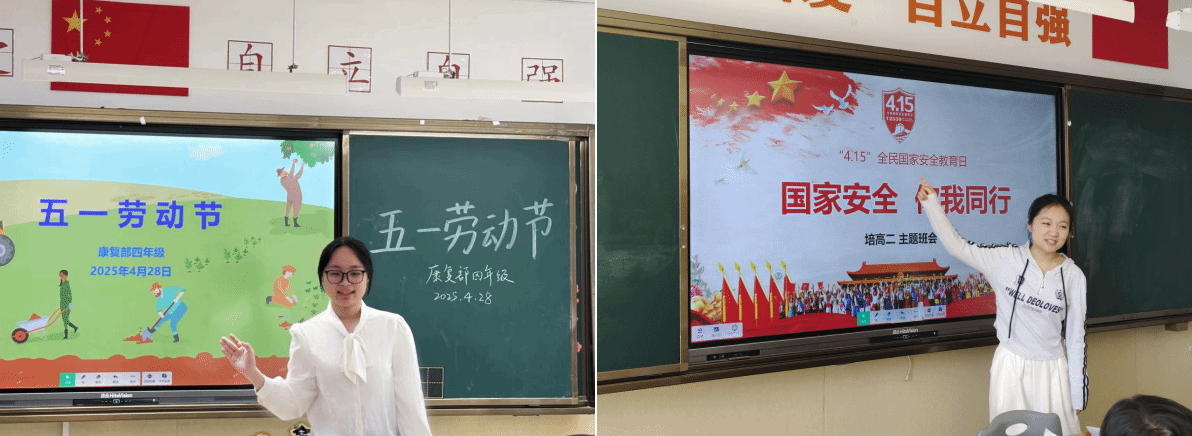 班主任工作是强化学生品德教育、文化教育和安全教育的重要抓手。任实习班主任期间,两位实习老师共开展20节主题班会课,从“防溺水”“防范校园欺凌、防范性侵”的安全教育,到传统节日“清明节”“劳动节”的文化传承,助力学生健康成长和全面发展。处理特殊事件若干起,面对学生情绪问题,运用运动放松、游戏疏导等方式,有效缓解学生焦虑情绪;在家校沟通上,定期开展线上与家长交流,及时反馈学生动态,搭建起家校共育的坚实桥梁。
