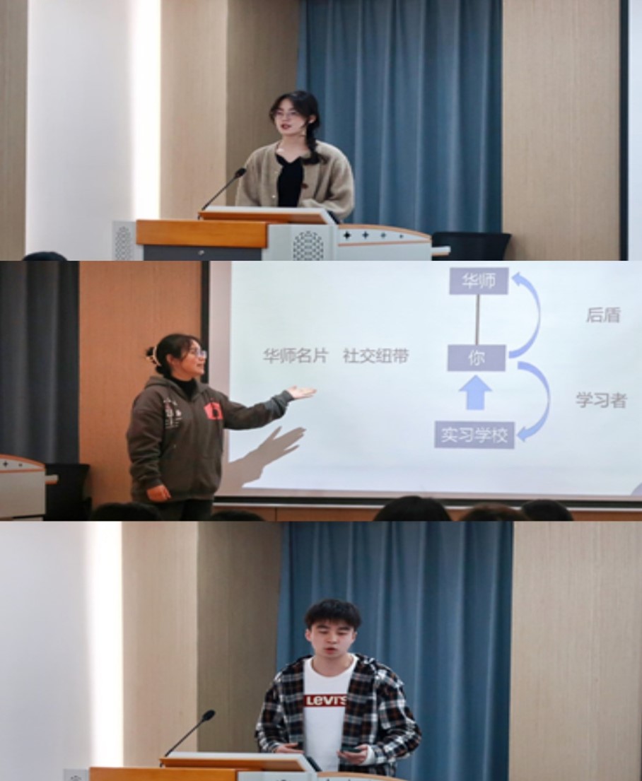 2020级特殊教育专业实习生代表肖函妤、王可珂和孙童分别从教学技能打磨,人际关系处理和实习注意事项三个方面分享了自己的实习体验与收获,为2021级同学们提供了实习工作的经验借鉴。