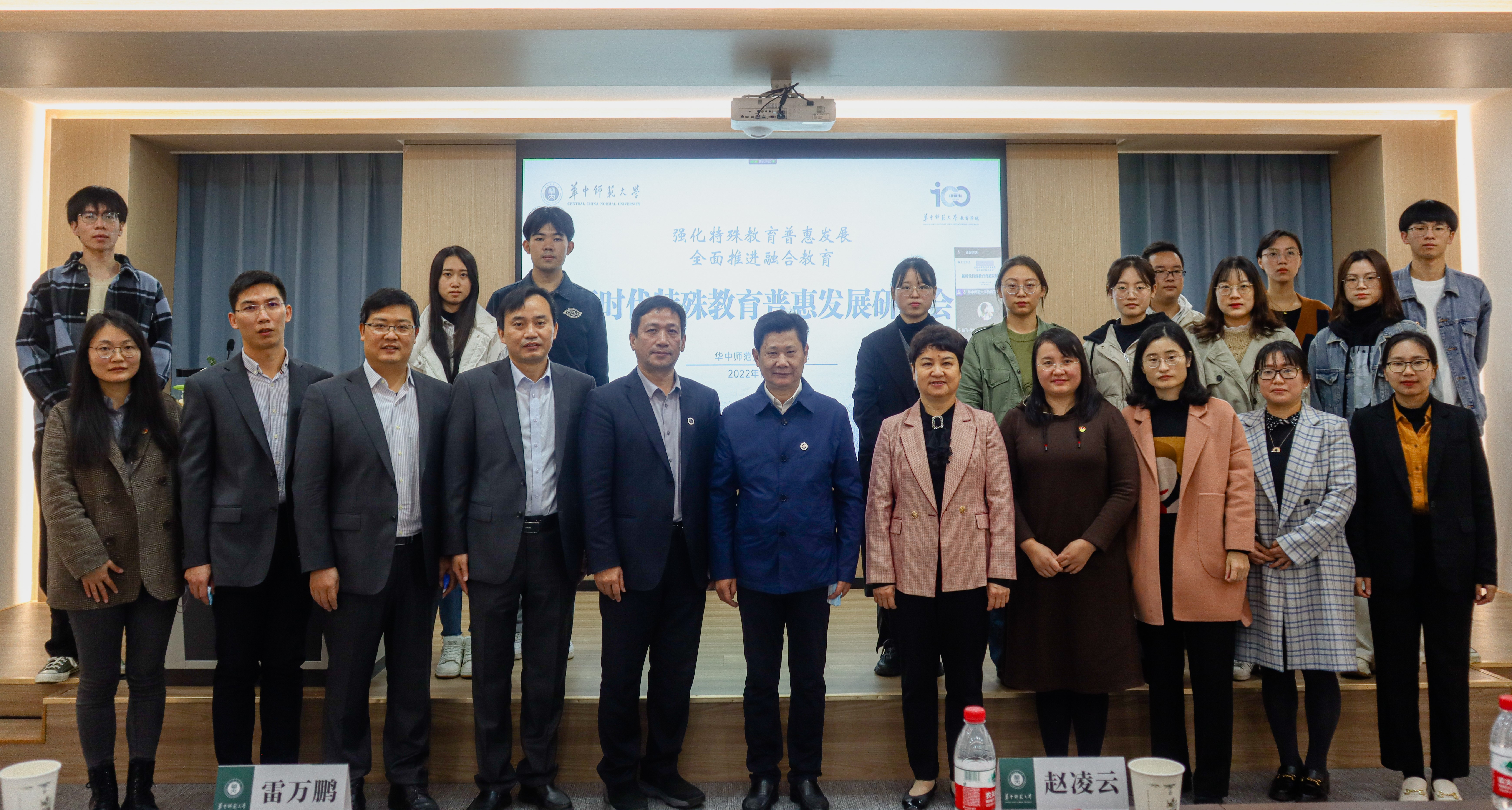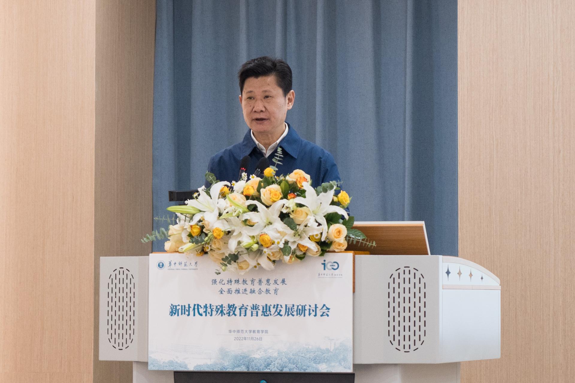 教育学院融媒体中心讯(通讯员 彭秦 宫慧娜 聂洁平) 11月26日,新时代特殊教育普惠发展研讨会在校举行。来自北京师范大学、华东师范大学、北京联合大学、西南大学等多所高校的专家学者,围绕“强化特殊教育普惠发展,全面推进融合教育”主题,对特殊教育普惠发展的路径、高质量特殊教育体系建设等议题进行了深入研讨。中国残疾人联合会副理事长程凯、教育部基础教育司特殊教育处处长黄伟、湖北省残疾人联合会副理事长袁雪梅、我校党委书记赵凌云出席开幕式,开幕式由雷万鹏院长主持。研讨会以线上线下相结合的方式举行,万余人次参会交流。