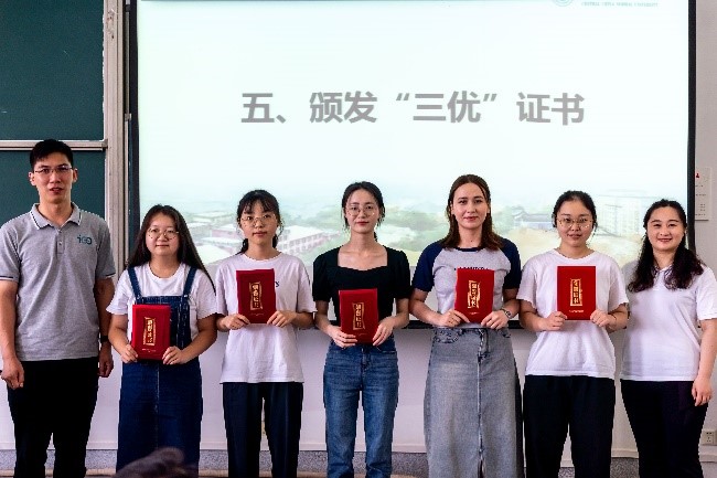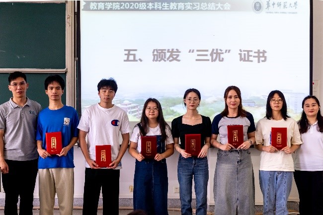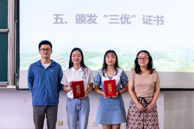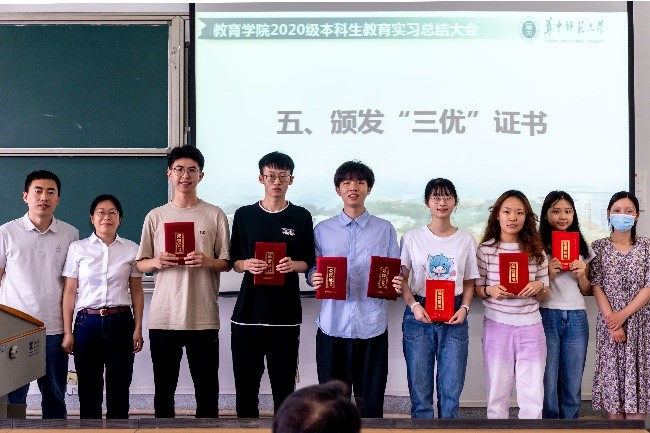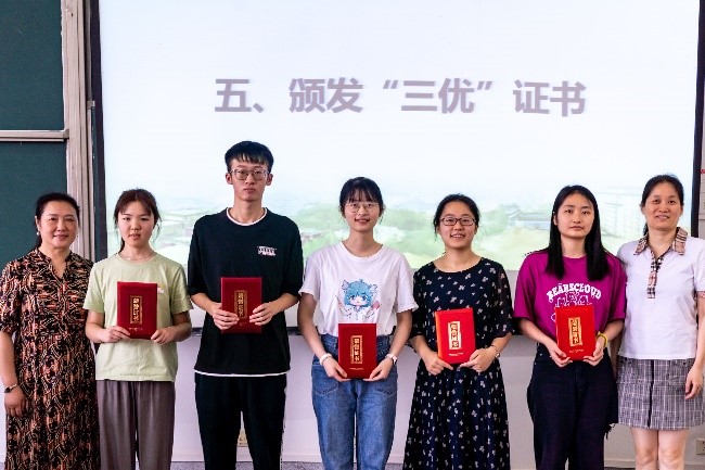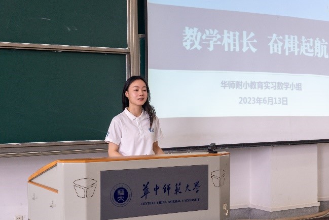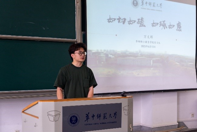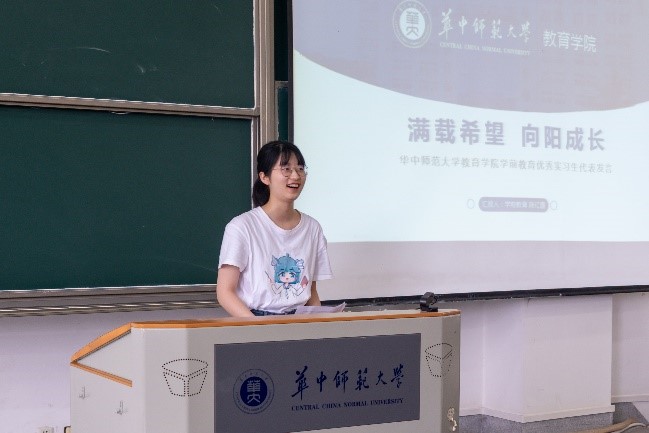 杨鑫林、谢里昂、肖函妤作为优秀实习小组代表发言。实习不仅能提高师范生技能水平,同时也培养了综合素质。三位同学立足实习小组实际,从教学实践、教研讨论、班级管理等方面介绍了小组成员互帮互助、共学共促的经历体验,并对实习工作提出了相关建议。