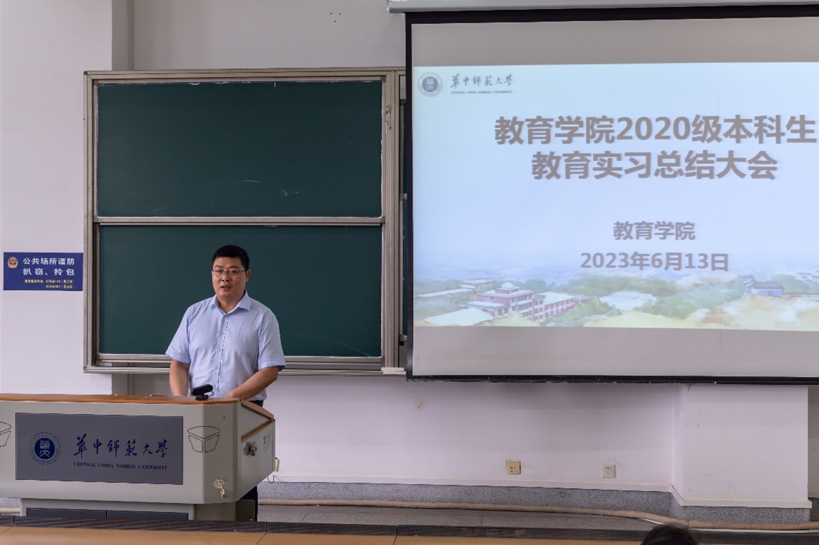 教育学院融媒体中心讯(通讯员 赵恒健 李青桂)2023年6月13日,教育学院2020级本科生教育实习总结大会在九号楼9401教室举行。教育学院教学副院长田友谊,党委副书记苏春艳,学前教育专业负责人吴航,特殊教育专业负责人徐添喜,实习指导教师代表熊淳副教授、邹红军副教授、张莉副教授、王任梅副教授、王雯副教授、李卉副教授、张娜副教授、孙玉梅副教授、宫慧娜博士、滕媛博士、杨大伟博士、王健老师,2020级本科生辅导员王倩倩,本科教学秘书高晓智出席,2020级全体本科生参会,大会由田友谊主持。