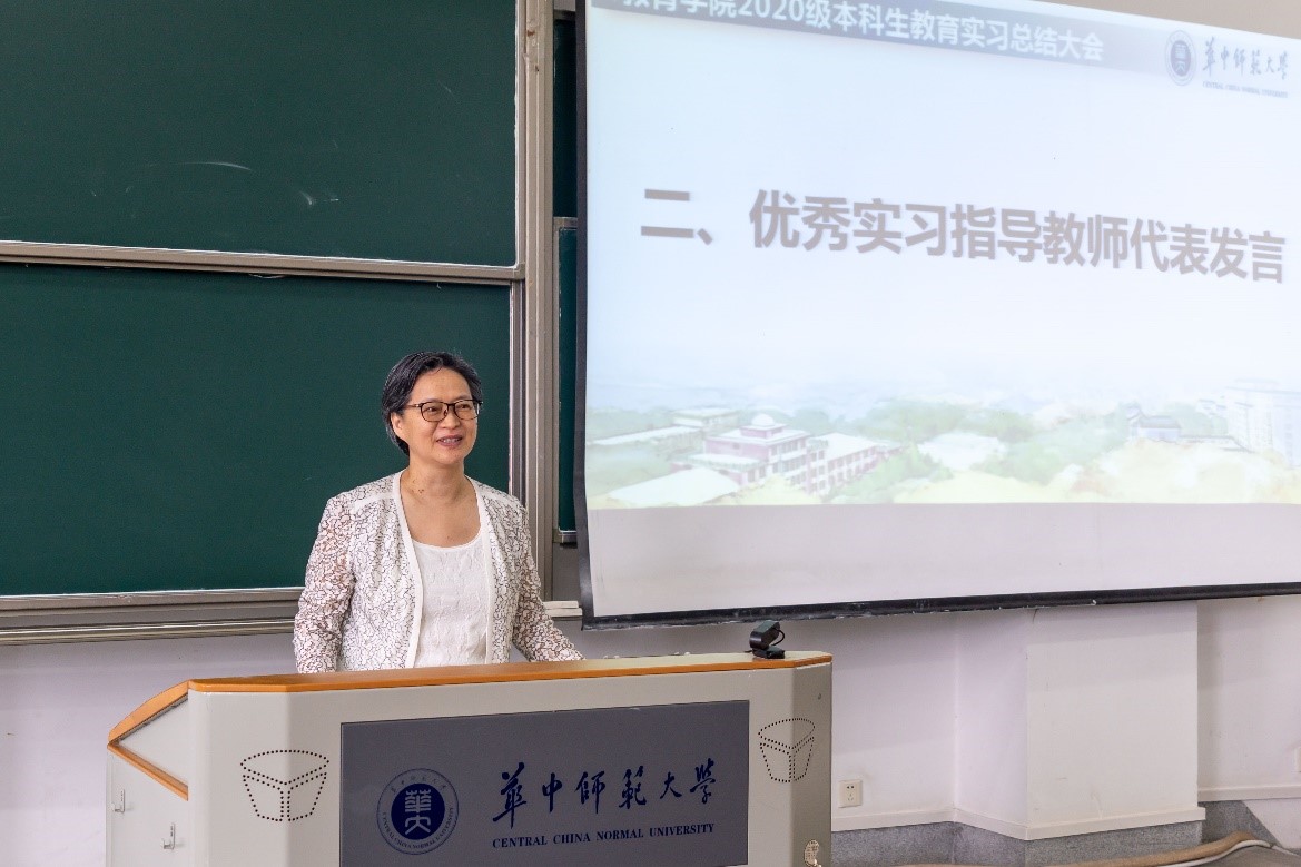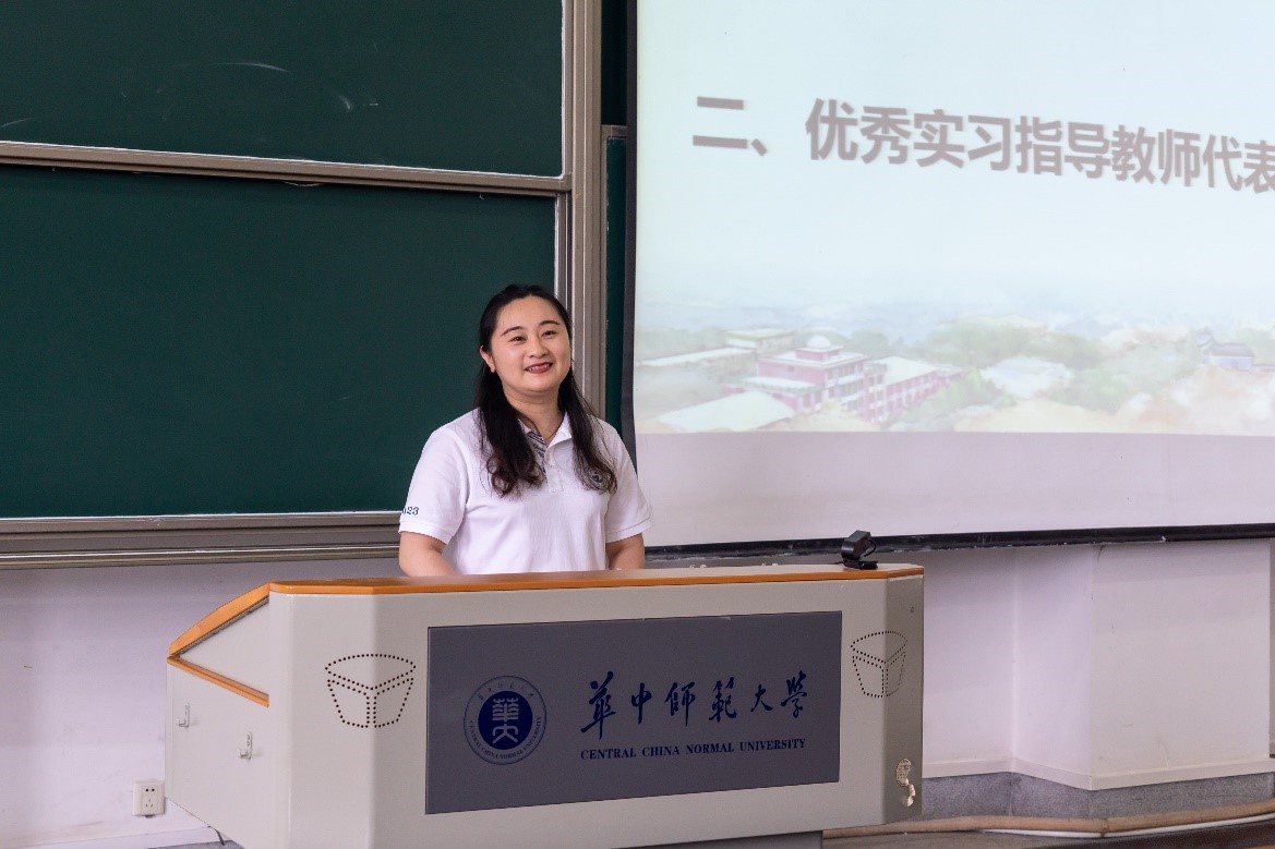 实习学生的成长进步离不开老师的悉心指导。优秀实习指导教师代表张莉对同学们圆满完成实习任务表示祝贺,赞扬了同学们富有爱心、肯于吃苦、虚心求教、自信创新、团结协作的实习表现,勉励同学们将实习中的思考带进专业学习、带到工作岗位,朝着成为一名优秀教育工作者的目标不断迈进。