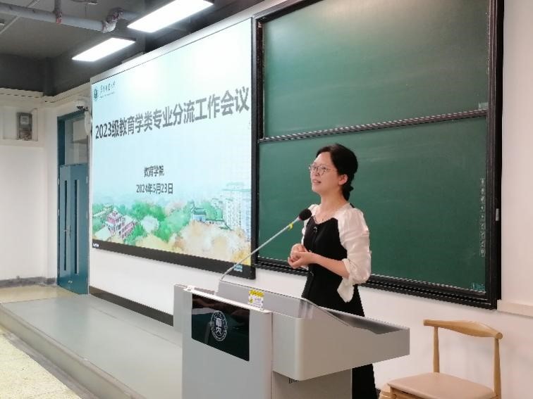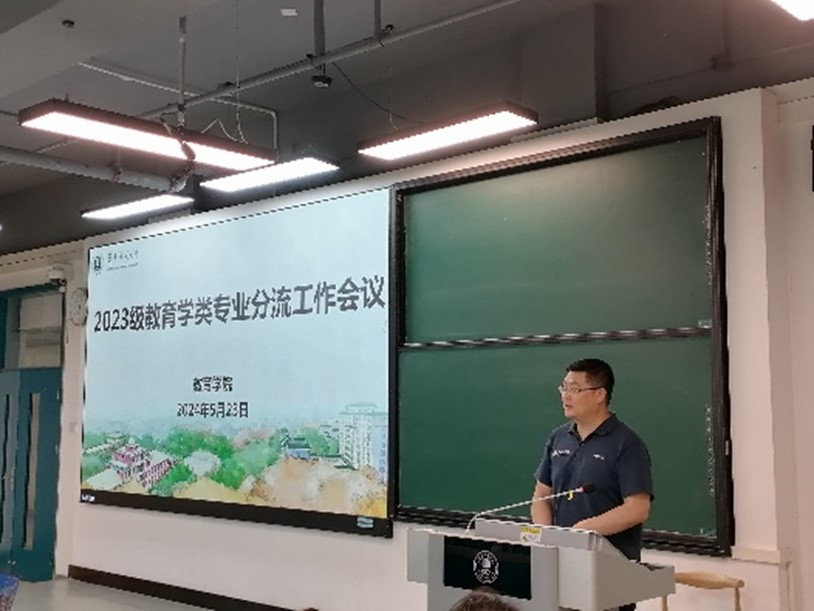 教育学院融媒体中心讯(通讯员 何瑜群)为加深我院2023级教育学类学生对专业分流政策的理解,引导学生在依据个人专业兴趣的基础上合理选择分流专业以更好地规划学业生涯,我院于2024年5月23日12:30在八号楼8301教室召开了2023级教育学类专业分流工作会议。教育学院党委副书记王璐、教育学系副主任孙银光、学前教育系副主任王任梅、特殊教育系主任徐添喜、融合教育专业教师代表苏慧、辅导员蔡亚男、本科教学秘书高晓智以及2023级教育学类专业全体学生参会。会议由田友谊副院长主持。