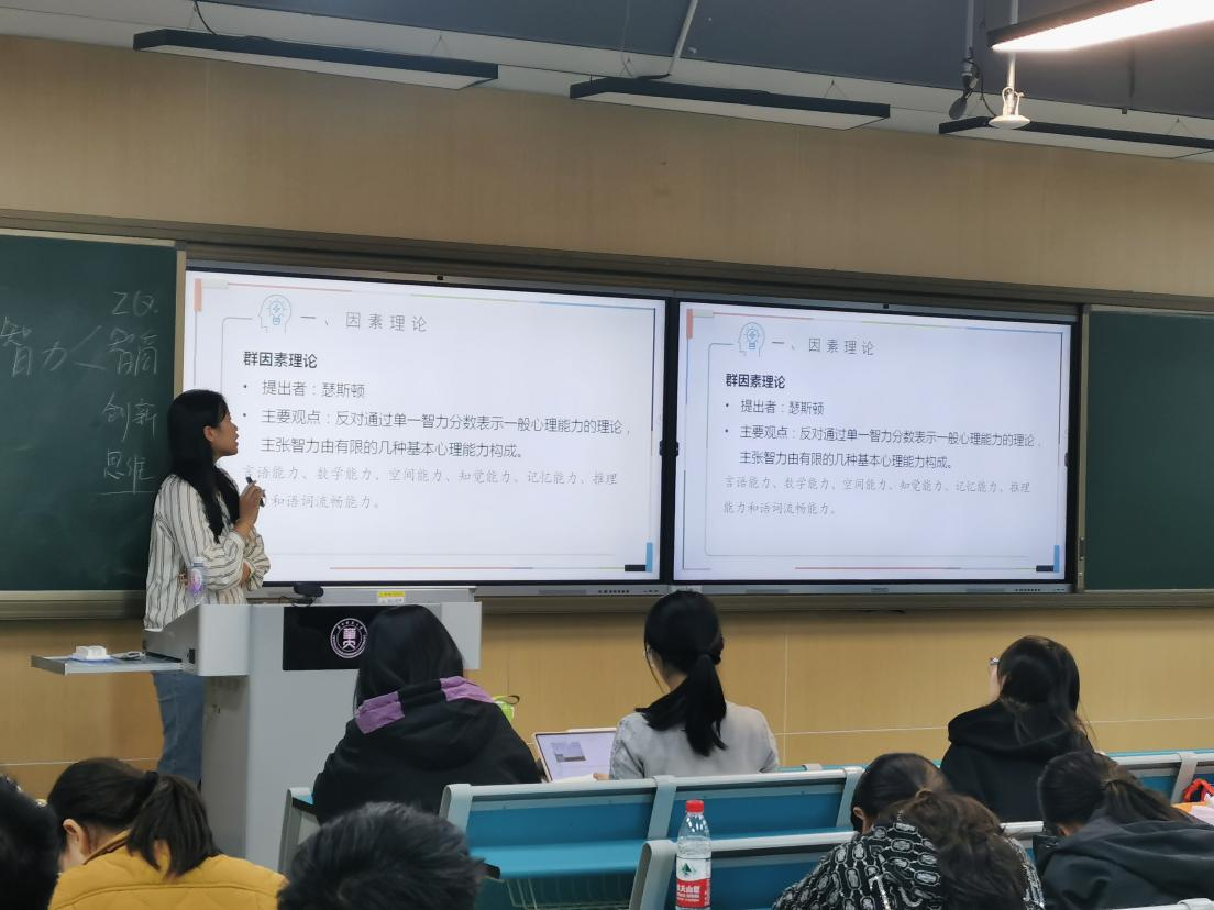 根据教学进度计划,何婷老师讲授了《普通心理学》中与“智力”有关的章节,对智力的概念以及经典的智力理论进行了讲解,并组织学生开展小组讨论,增进对学习内容的理解。