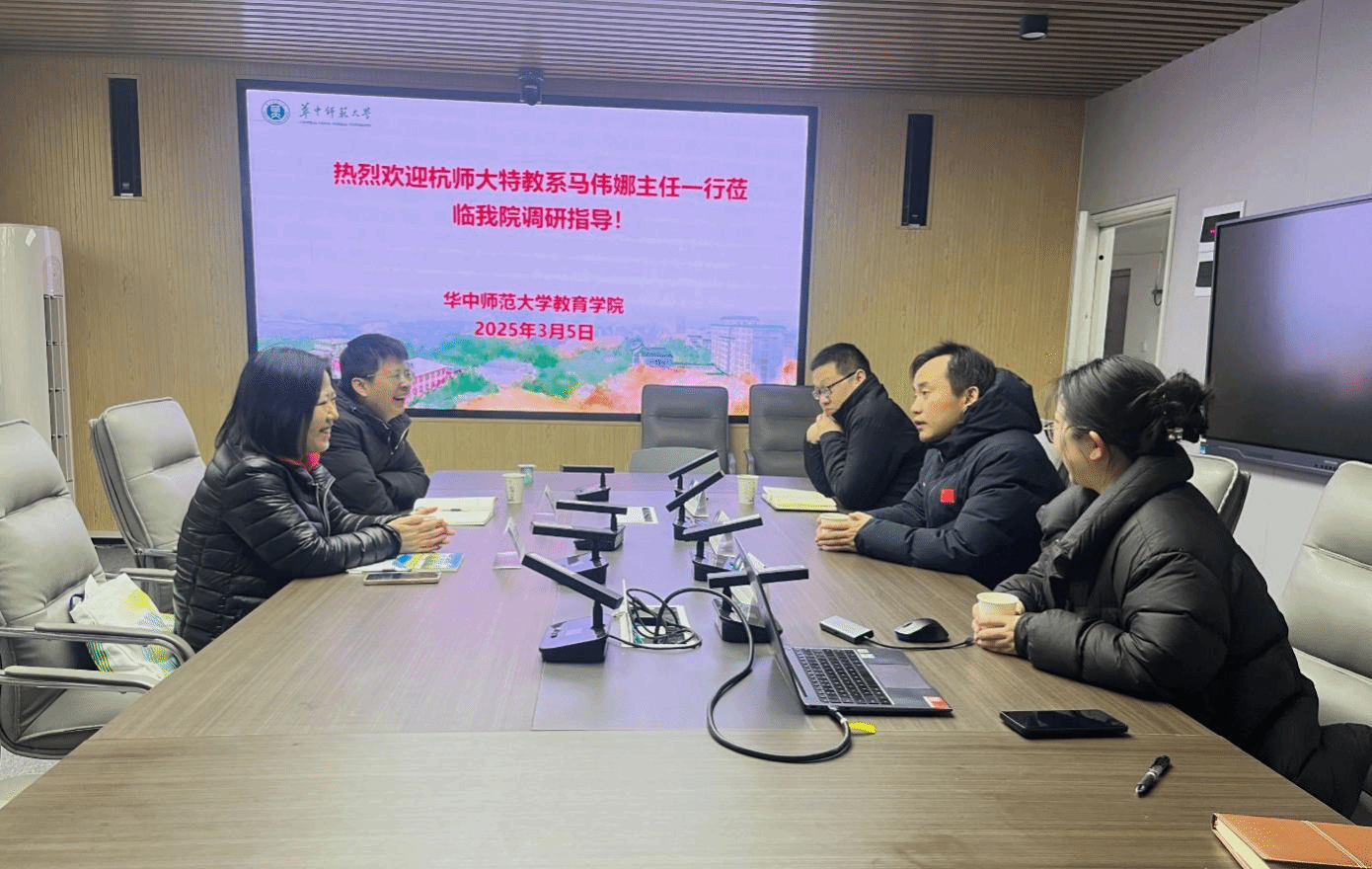 教育学院融媒体中心讯(通讯员 孙玉梅 夏儒斐)3月5日上午,杭州师范大学经亨颐教育学院特殊教育系主任马伟娜教授、系副主任连福鑫副教授一行来我院访问交流。教育学院院长雷江华教授、特殊教育系主任孙玉梅副教授、教育学实验教学示范中心副主任王崇高博士、实验室管理员夏儒斐老师参会交流。交流会在田家炳楼319会议室举行,由孙玉梅主持。