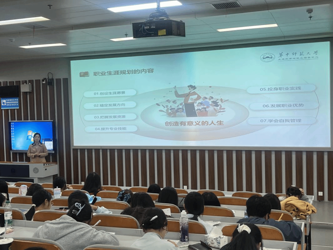 其次,王璐副书记聚焦于专业和职业的联系与区别,以教育学院招生视频带领同学们认识学院专业设置和培养内容,进而阐述了职业的定义,厘清了两者间的对应关系,引导同学们绘制个人“专业-职业”发展地图。