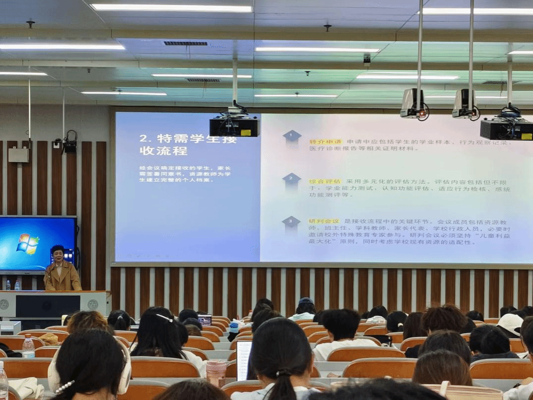 讲座的最后,王霞校长就“我们怎么做”展开重点介绍。她围绕融合教育实践路径,先向“准教师”们分享了注意力缺陷障碍、孤独症等特殊儿童核心症状的高效判断方法;再详解融合管理体系,涵盖概念、理念、安置形式、环境创设及资源教师核心角色,并以武昌区“一体三翼”模式与“真接纳、善引导、助自立”目标为例,介绍区域管理流程;最后王霞校长向全体新生展示武昌区培智中心学校融合共建案例及流程,提供了直观实操参考。